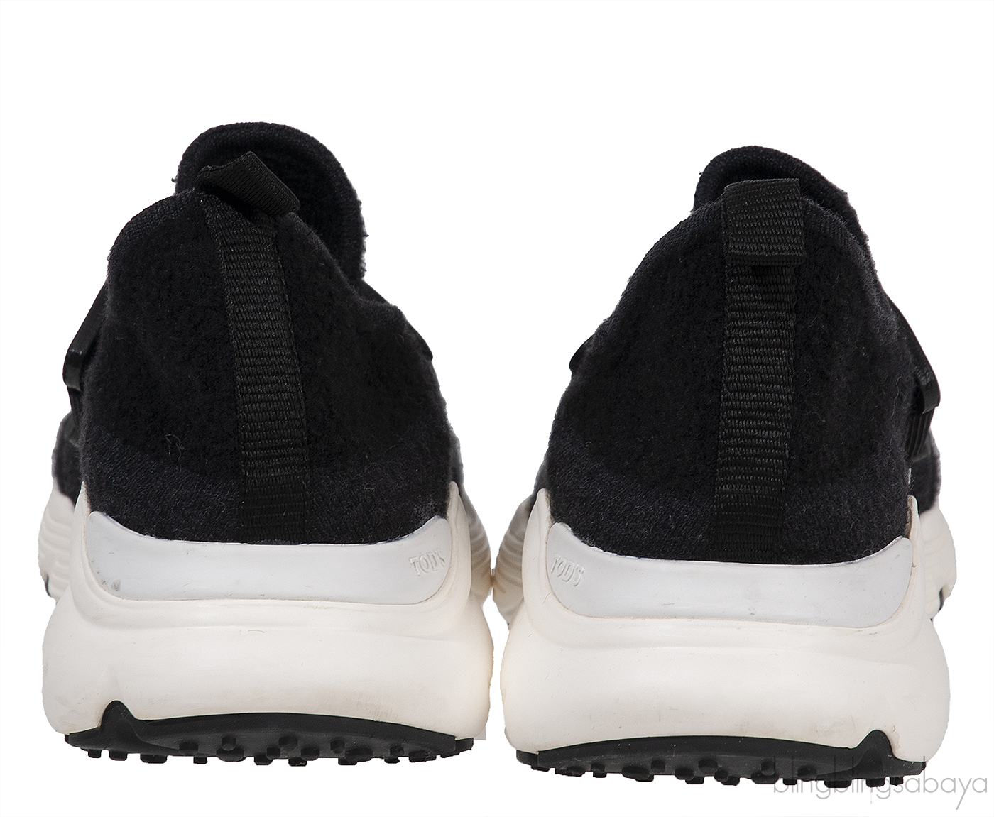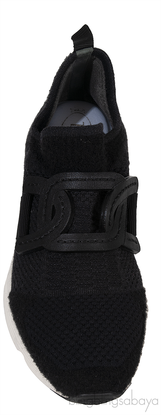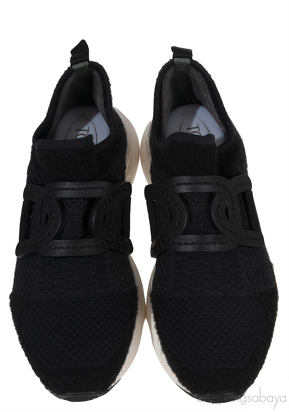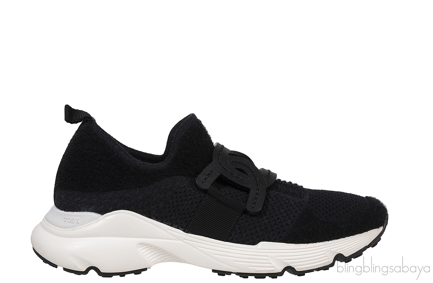 These Kate Slip-on Trainers Black from Tod's in crafted in elasticated technical knit upper embellished with the brand's signature leather chain. These sneakers features an almond sole, fabric upper and lining, fabric insole and has rubber sole.