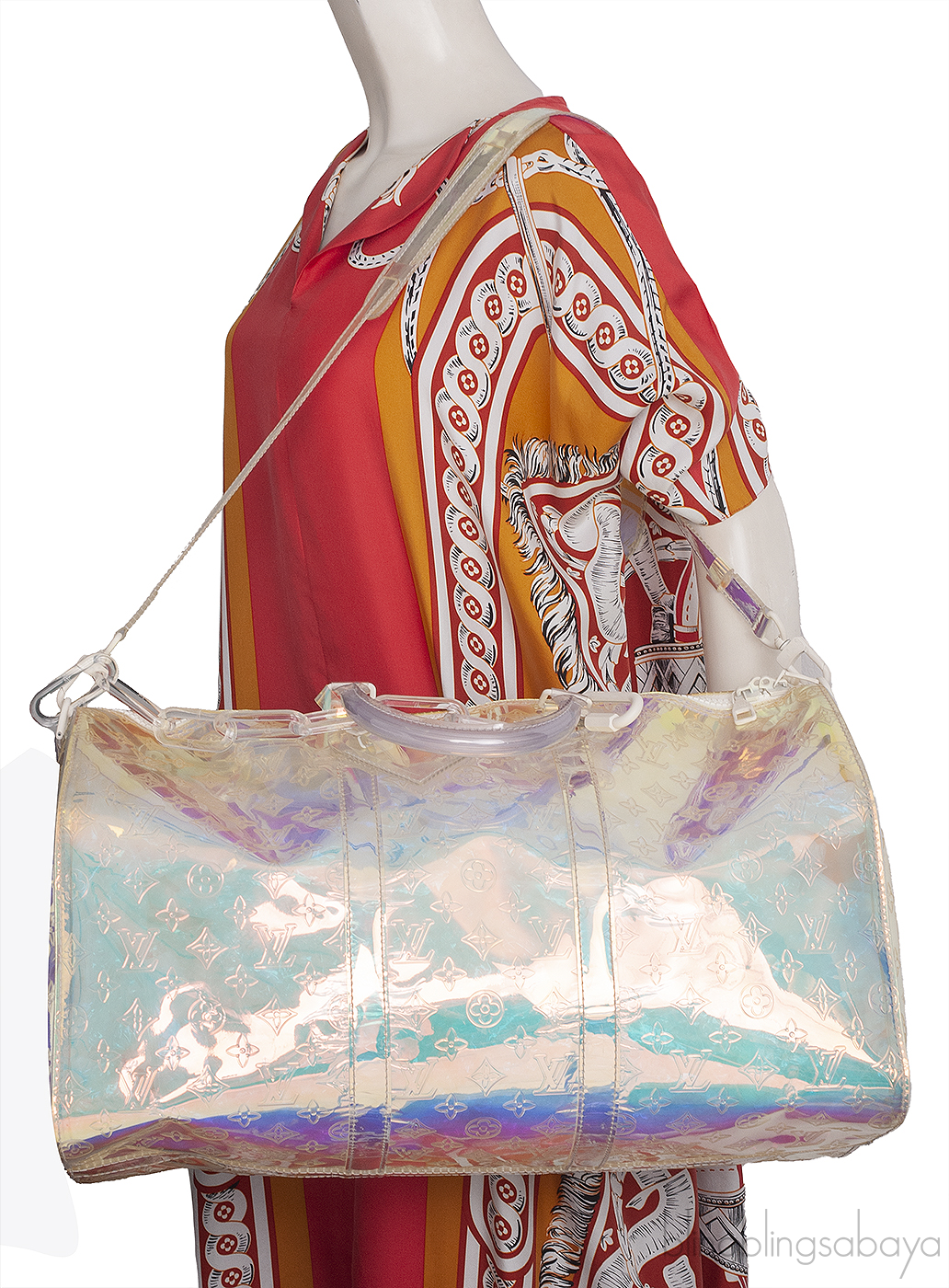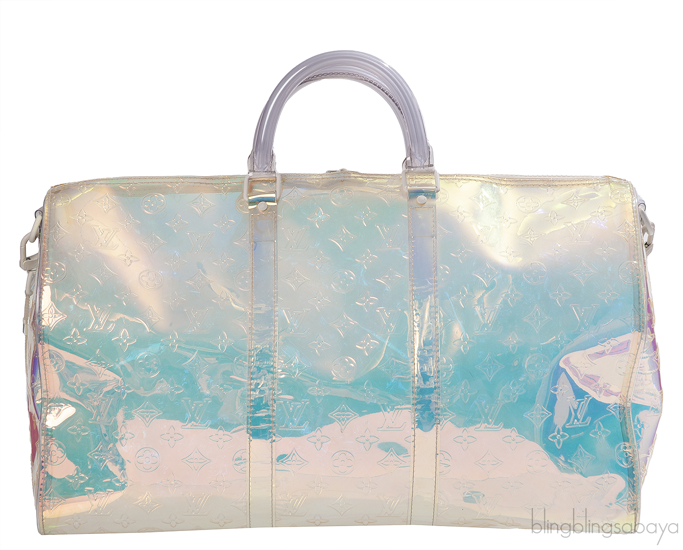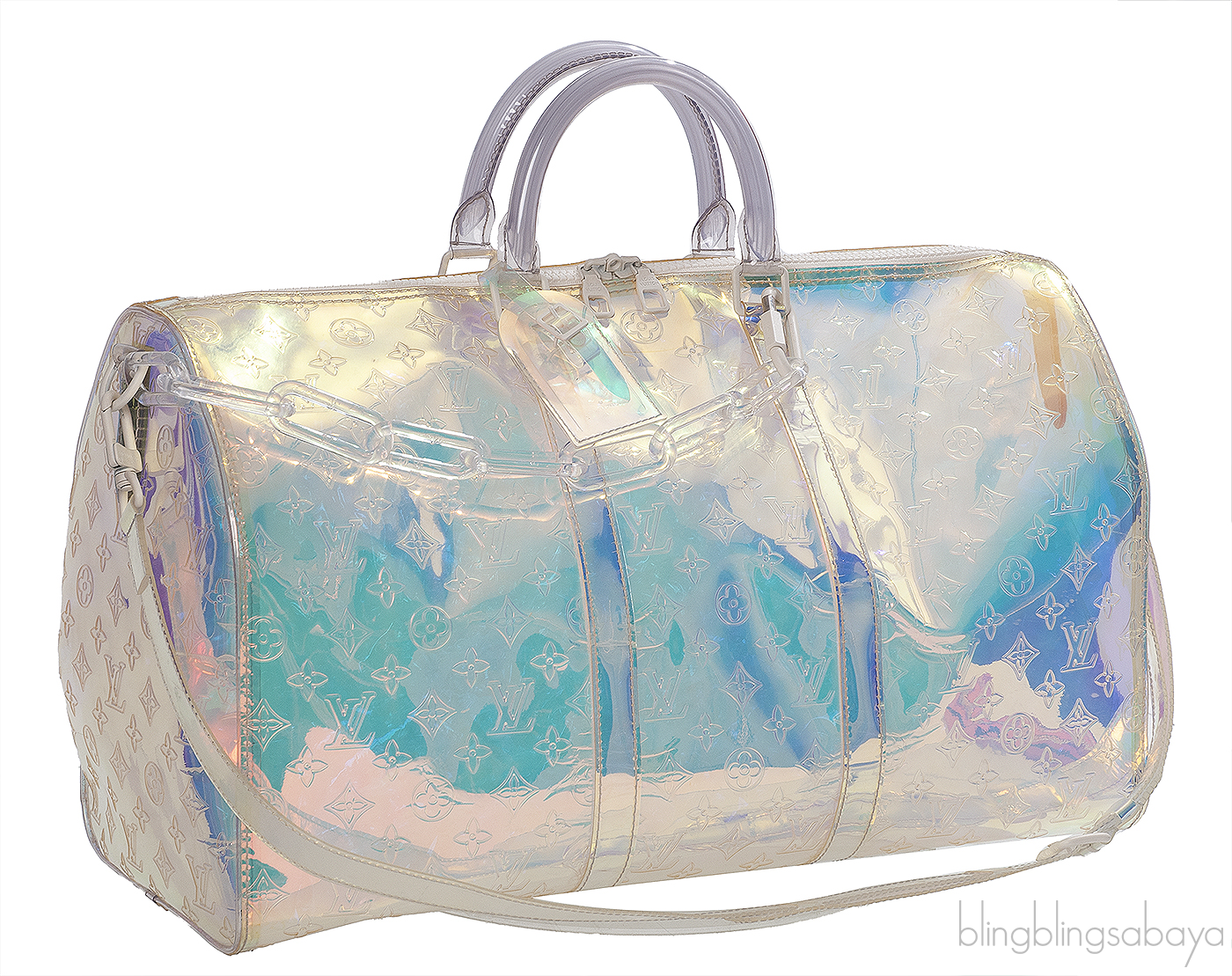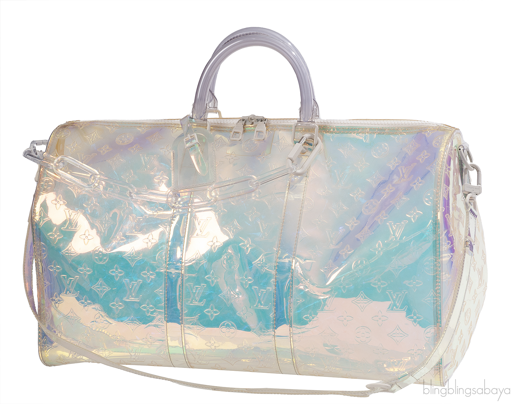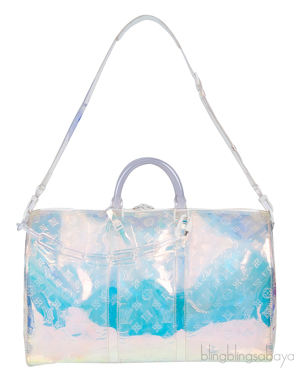 This Limited Edition Monogram Prism Keepall Bandouliere 50 from Louis Vuitton is crafted from transparent monogram-embossed PVC with white hardware. This travelling bag features a two handles and a plastic chain strap and two-way zip fastening at top.