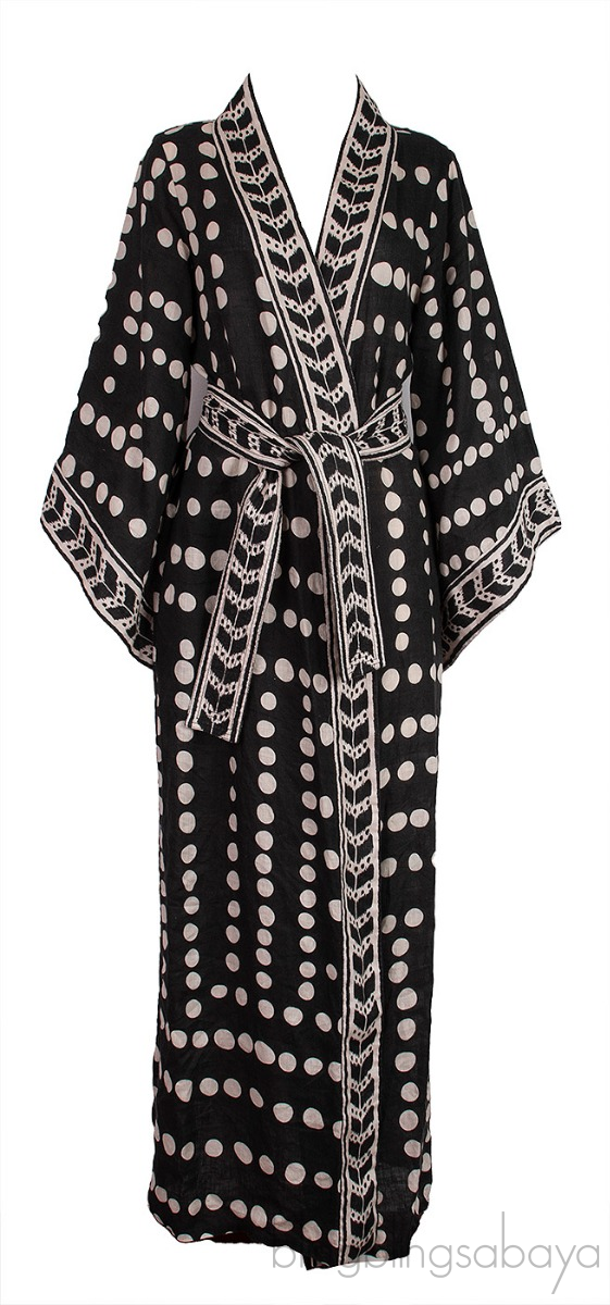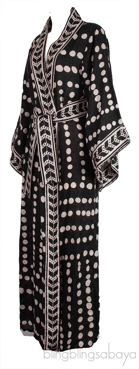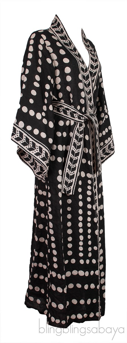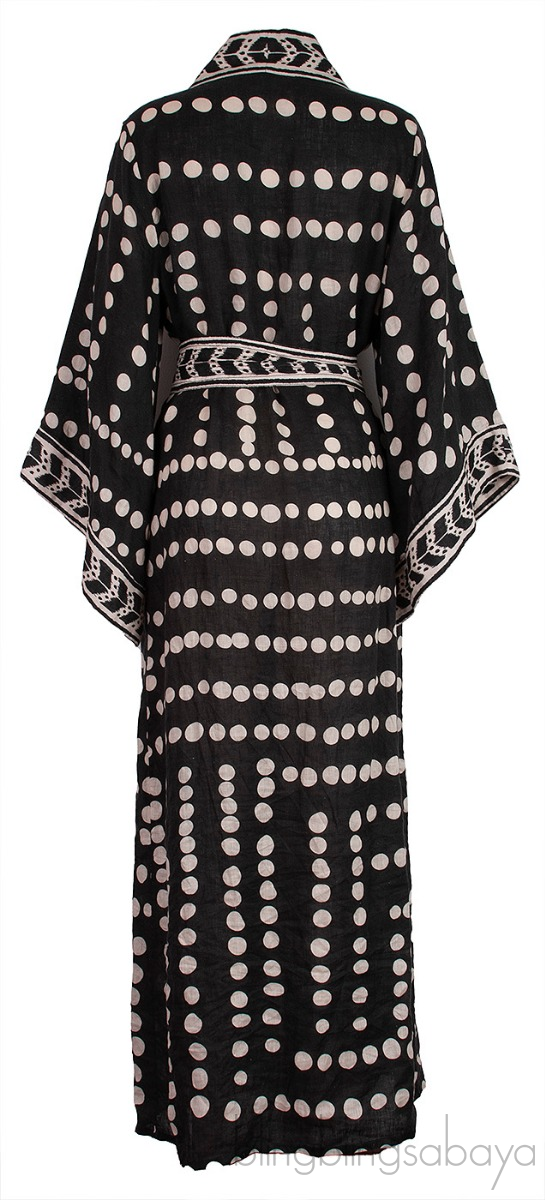 This Kuba Bambala Cotton Poplin Kimono from Johanna Ortiz is crafted from 100% linen. This Kimono features a black and white polka dot print all-over, open front, long sleeves, side pockets and detachable fabric belt.