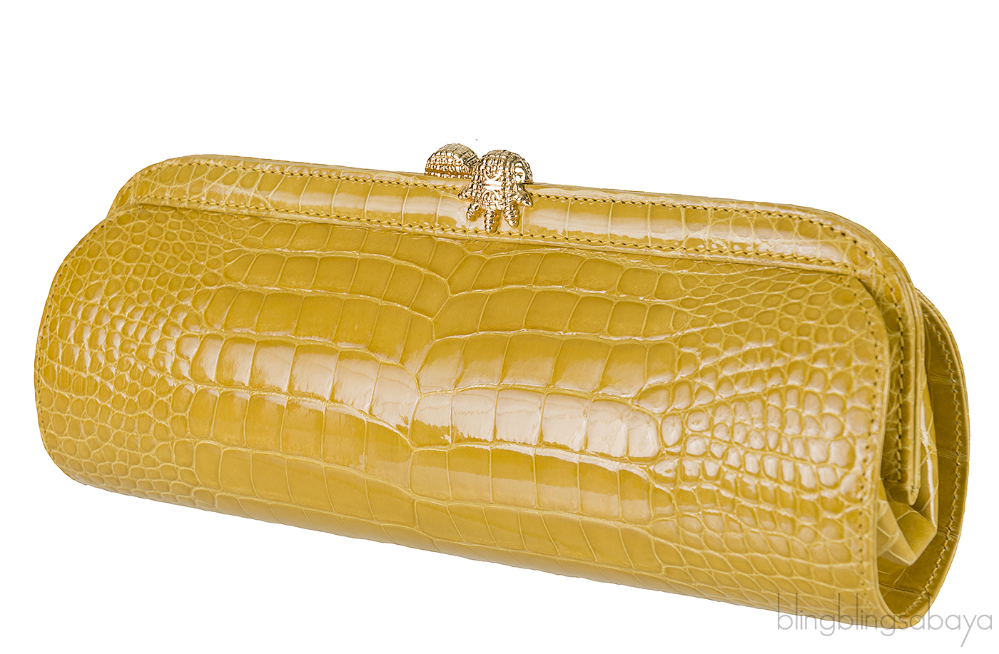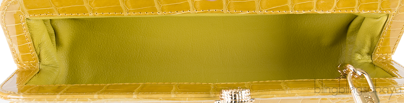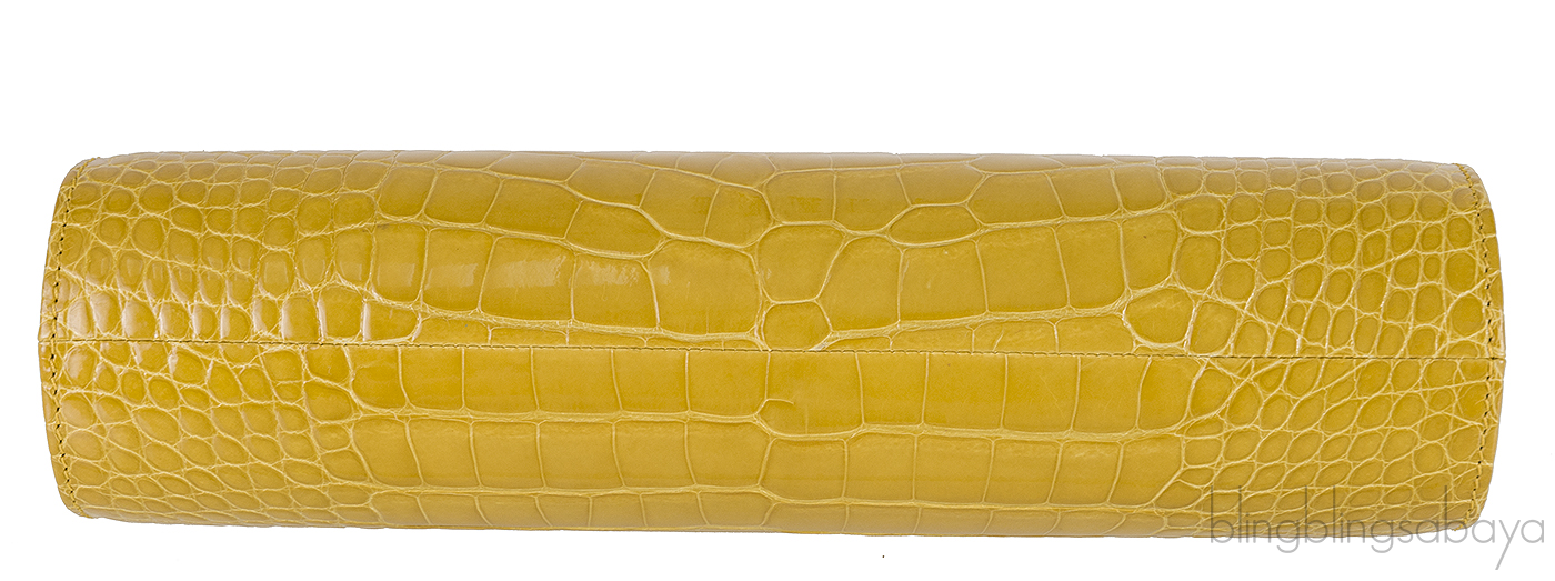 This long stunning hard clutch features a long oval design, framed top with gold croc feet push lock magnetic closure. Interior is fully lined with yellow leather, metal plate engraved With KWANPEN signature and has 1 interior zip pocket.