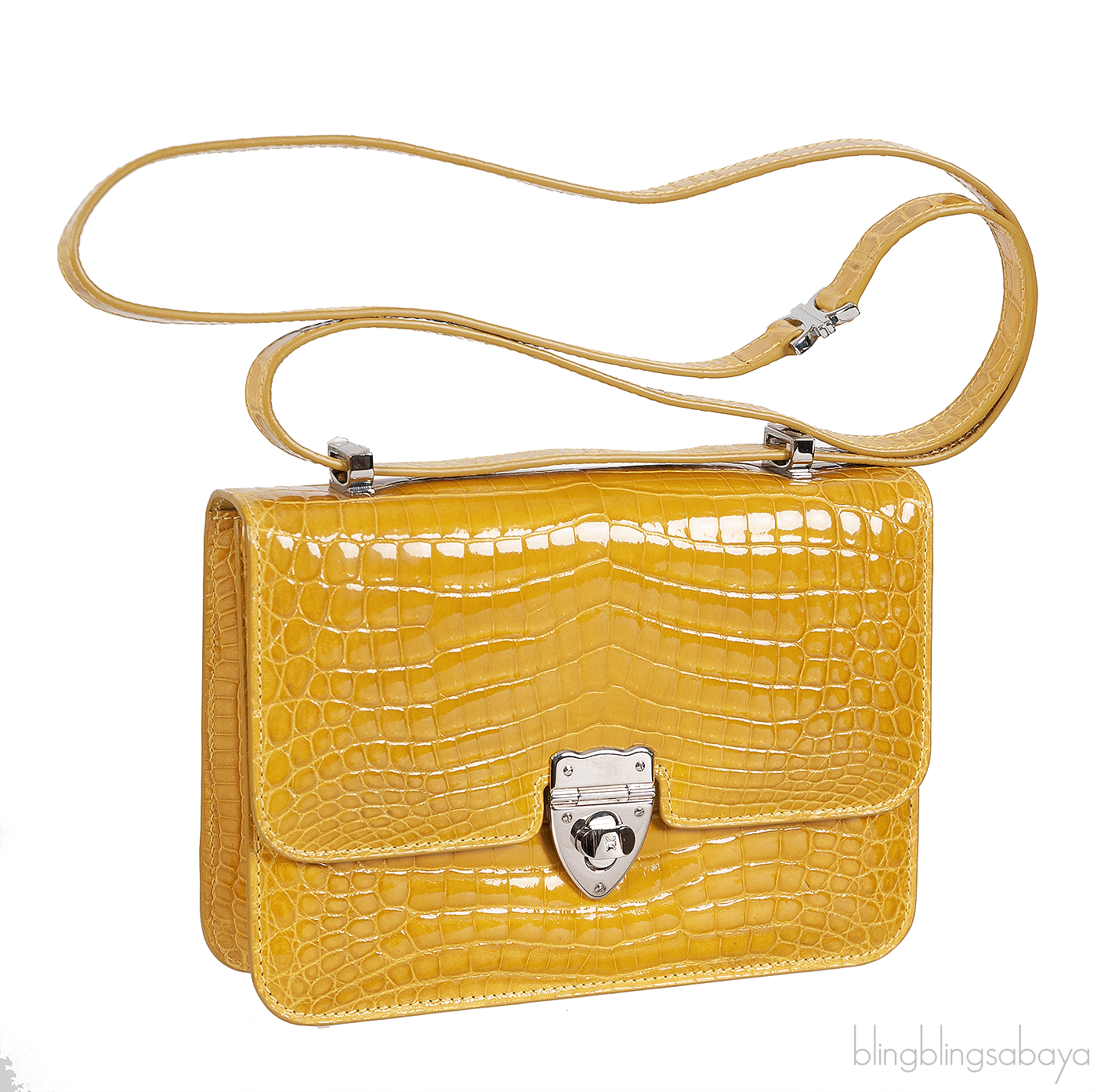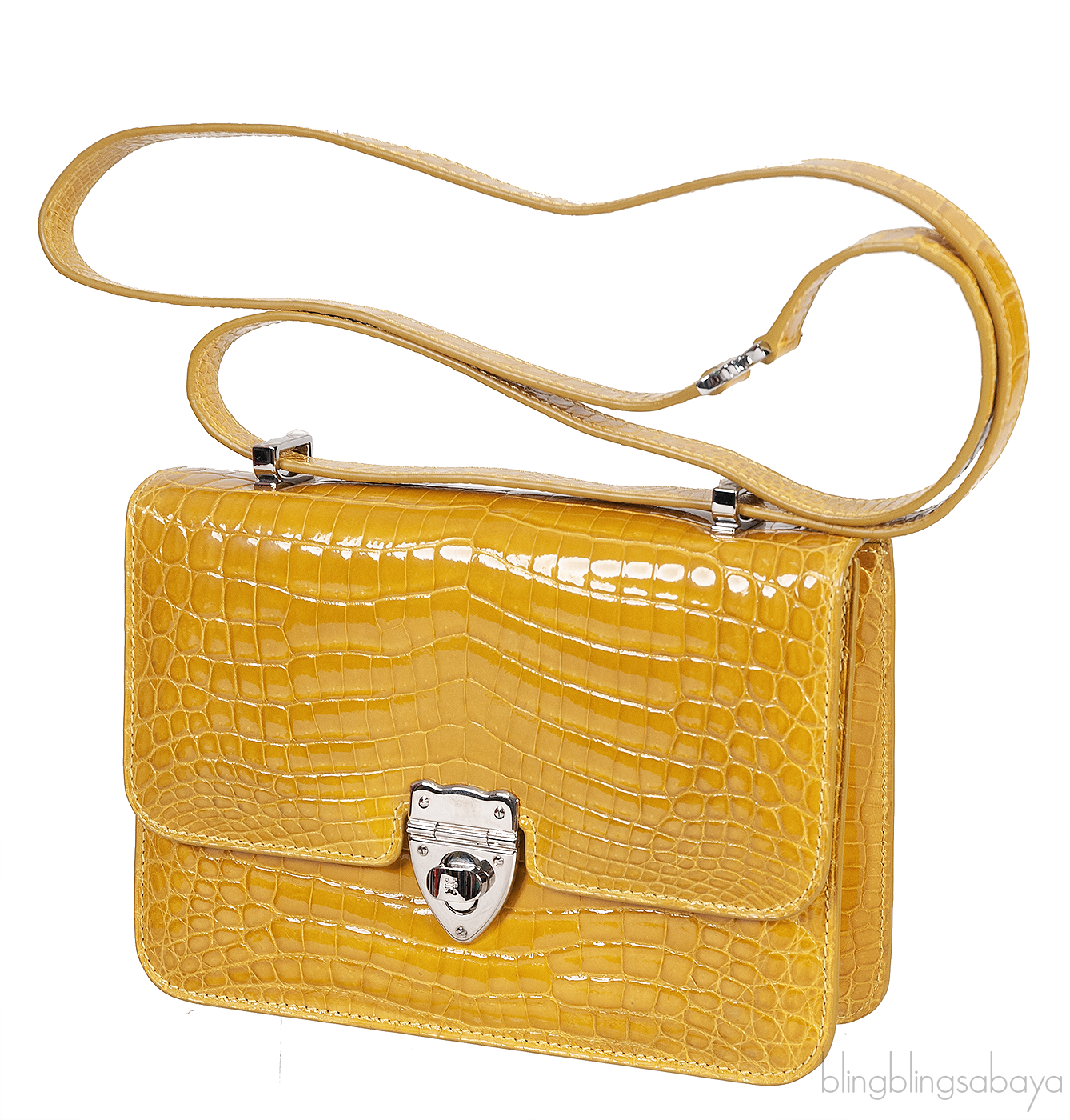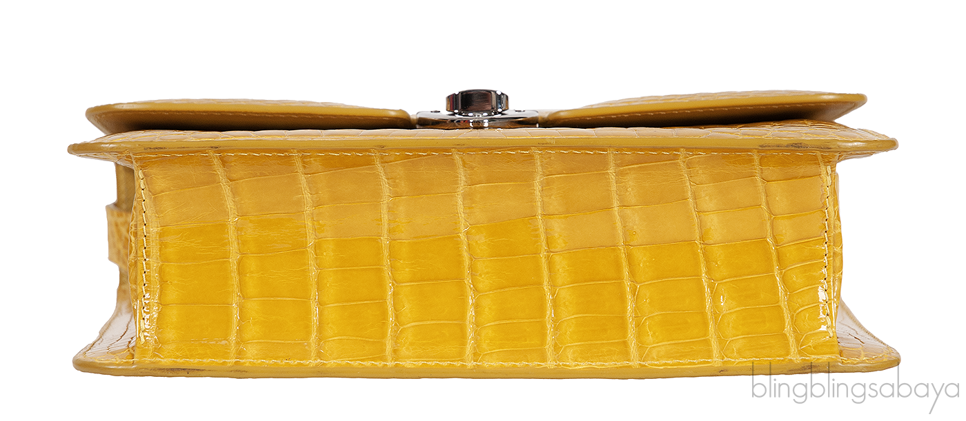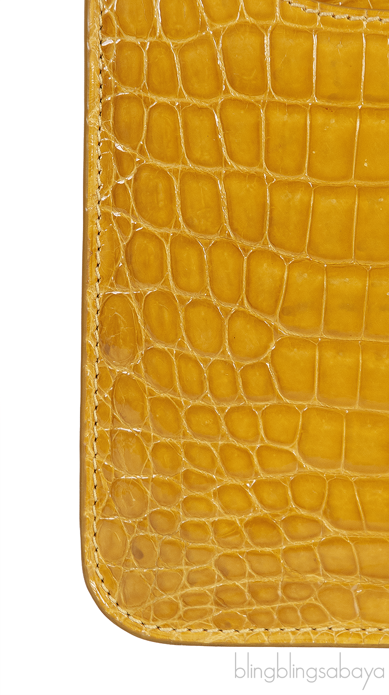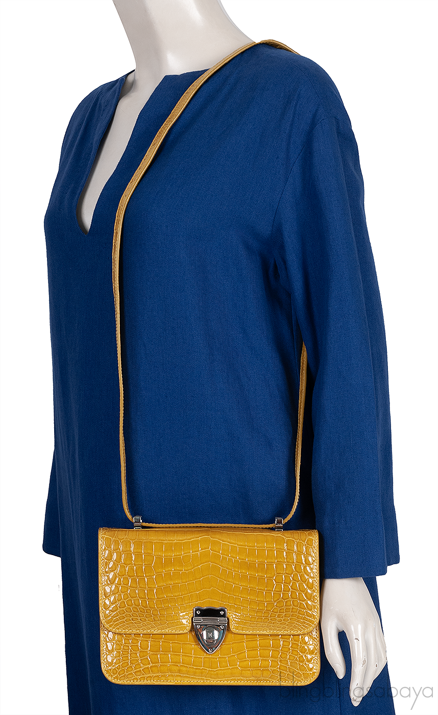 This Mustard City Cruiser Sling Bag from Kwanpen is beautifully crafted from a precious exotic crocodile leather in patent mustard accented with palladium hardware. This petite City Cruiser Sling Bag is the ultimate day to evening bag featuring a hard, sleek and structured lines meeting subtle curves with long leather shoulder strap.