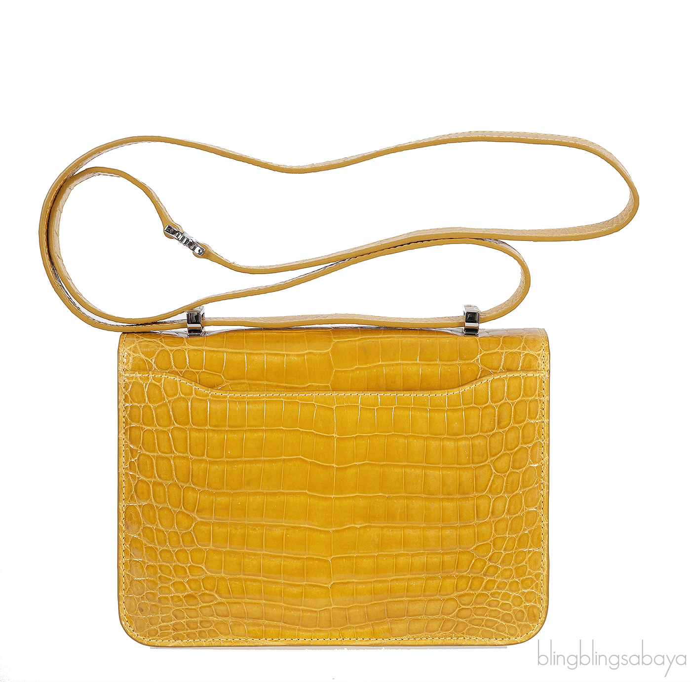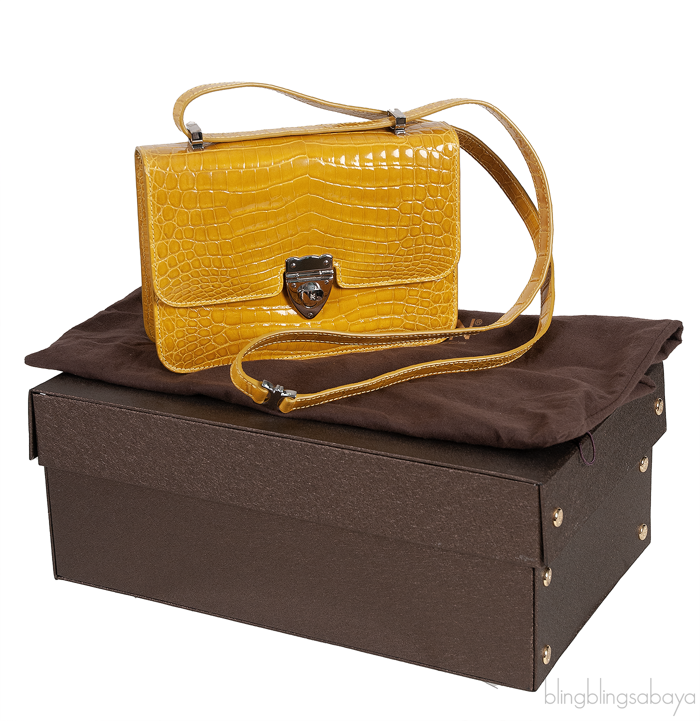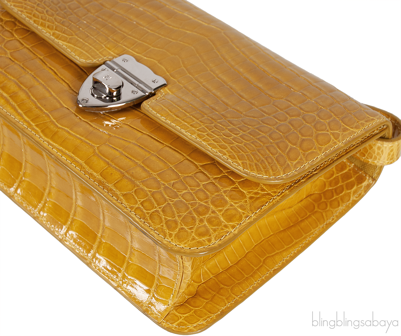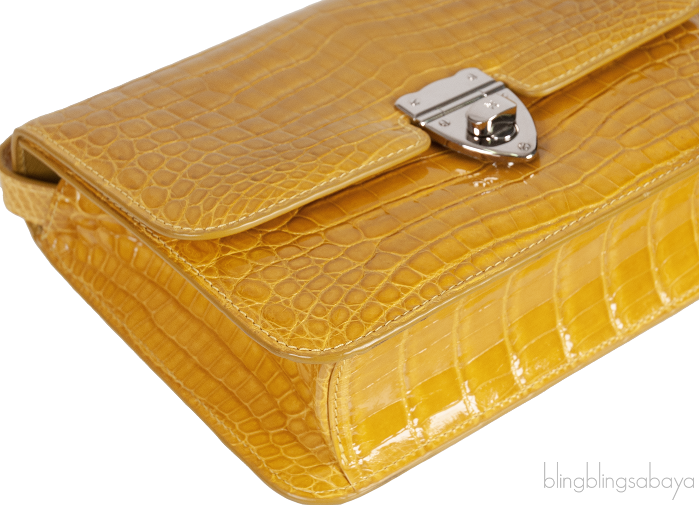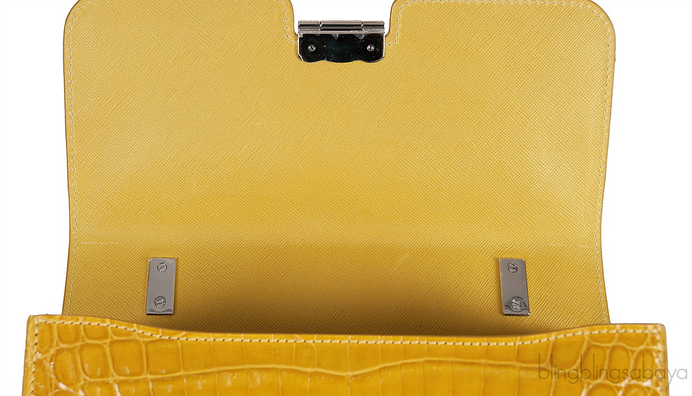 This Mustard City Cruiser Sling Bag from Kwanpen is beautifully crafted from a precious exotic crocodile leather in patent mustard accented with palladium hardware. This petite City Cruiser Sling Bag is the ultimate day to evening bag featuring a hard, sleek and structured lines meeting subtle curves with long leather shoulder strap.