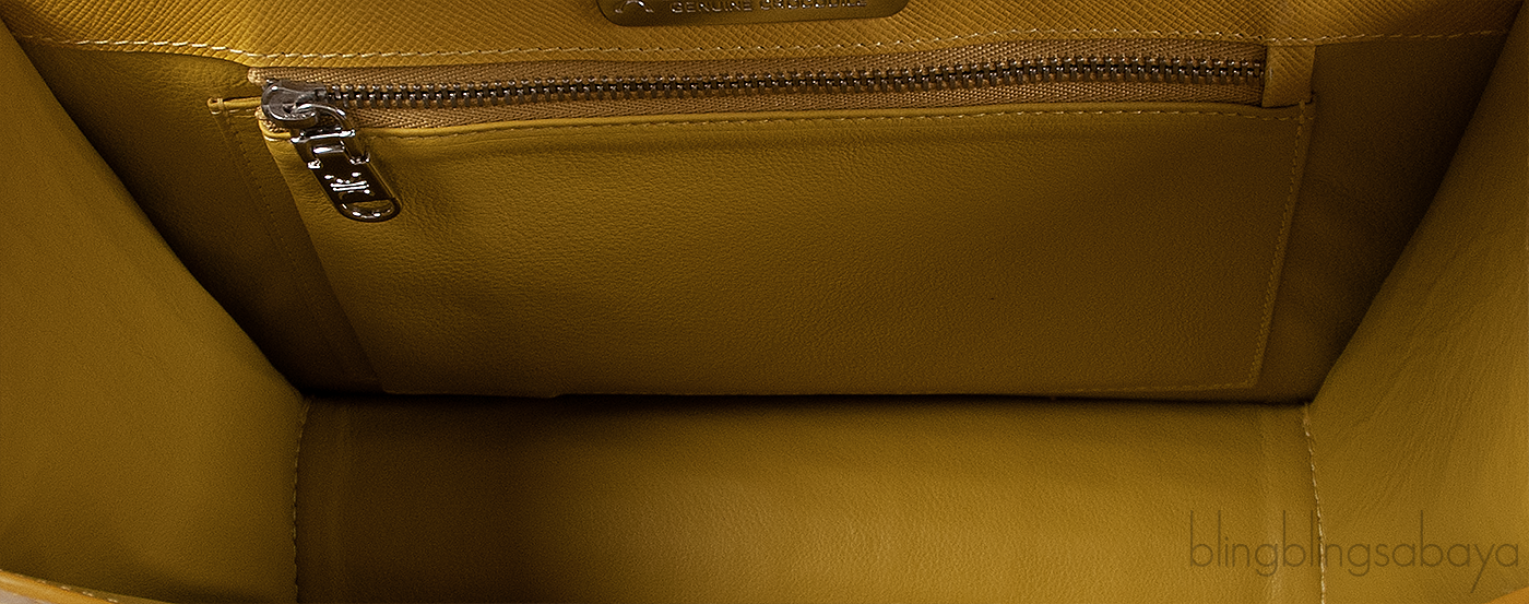 This bag has a flap cover with a signature turn-lock closure, interior is fully lined with coordinating leather and has one large compartment; one interior zip pocket and one interior metal plate engraved with KWANPEN signature.