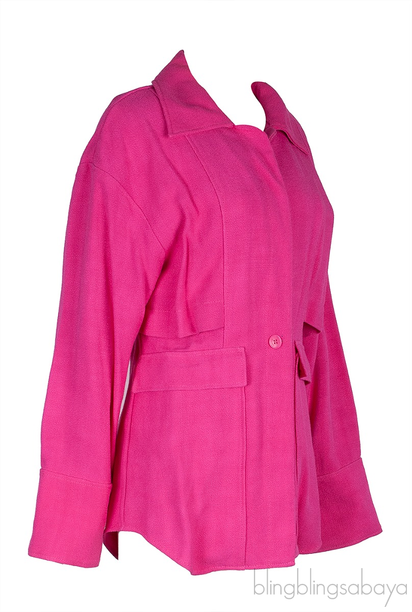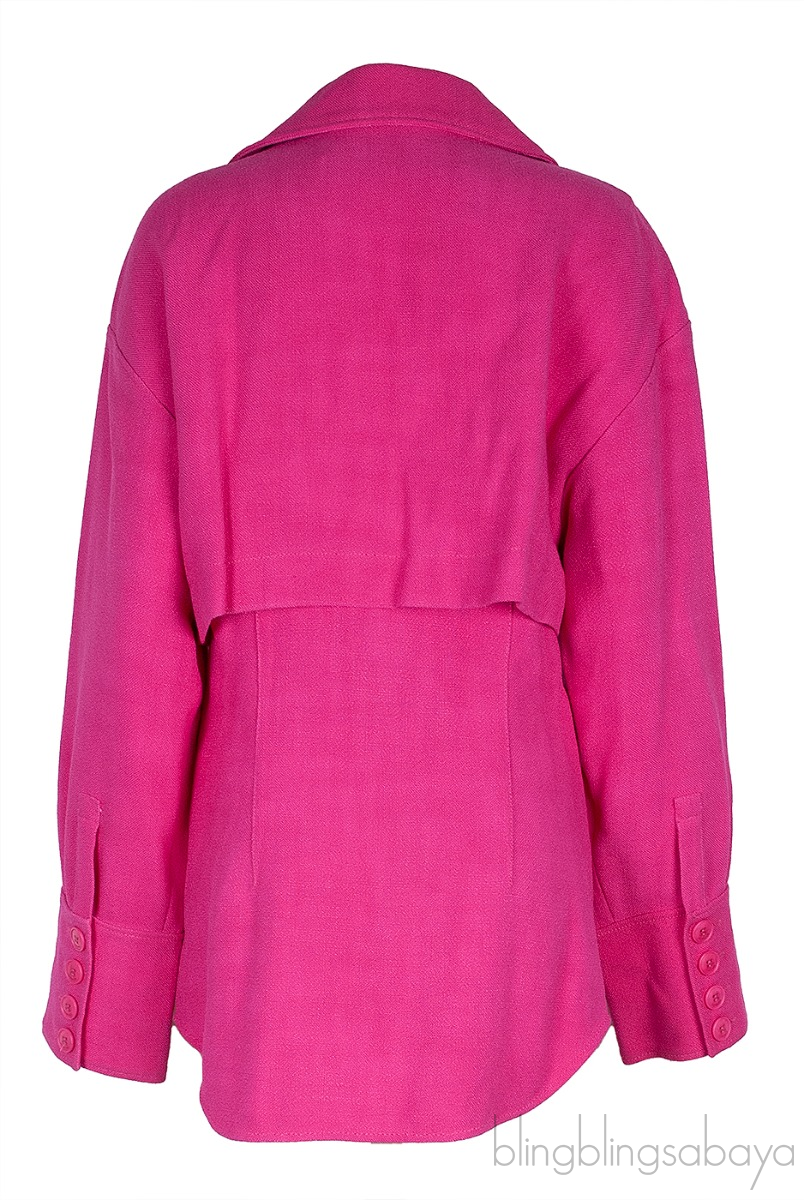The vibrant pink garment has an open collar and unique architectural characteristics, including panels that are adjacent to duster panels and a curved hem.