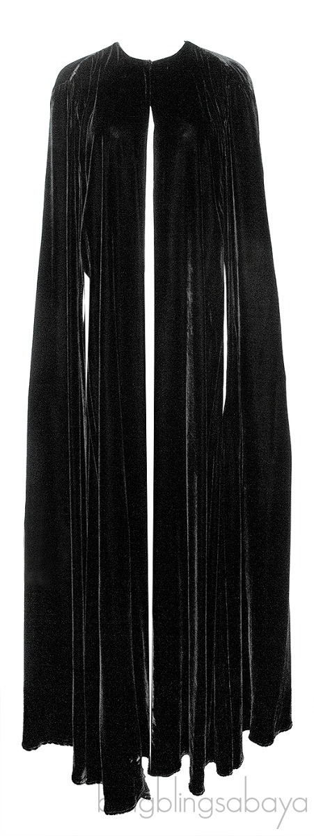 This Black Velvet Cape from La Mania is crafted from Viscose and Silk fabric in black. This black cape features a snap fastening at front, deep-V at back, and side opening for arms.