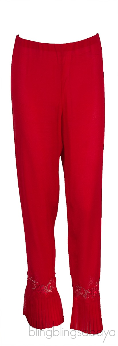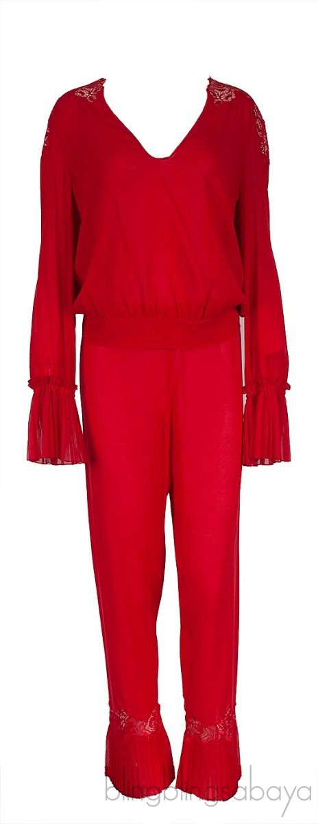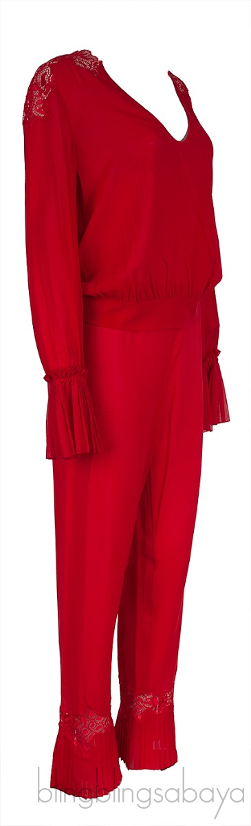 This La Perla Red Pleated Trim Silk Pajama Set is crafted from polyamide and elastane fabric in red hue. Top features a v-neckline, long sleeves with pleasted cuffs, elastic hemline and lace detailing on shoulder. Trouser features an elastic waistline, lace and pleated hemline.