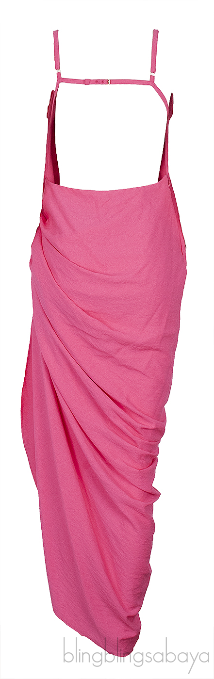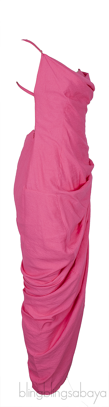 This La Robe Saudade Pink Voile Maxi Dress from Jacquemus features a figure skimming style in pink voile with a draped neckline, sleeveless, strappy open back, side zip fastening, open along one leg, adjustable shoulder strap and one side ruching.