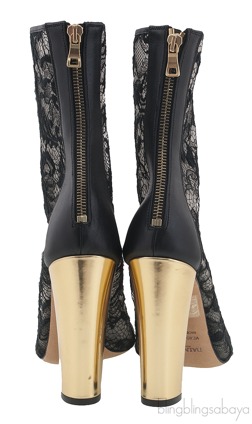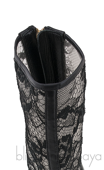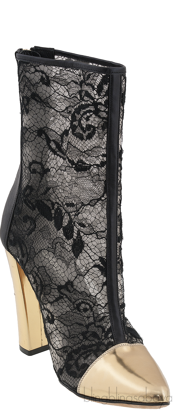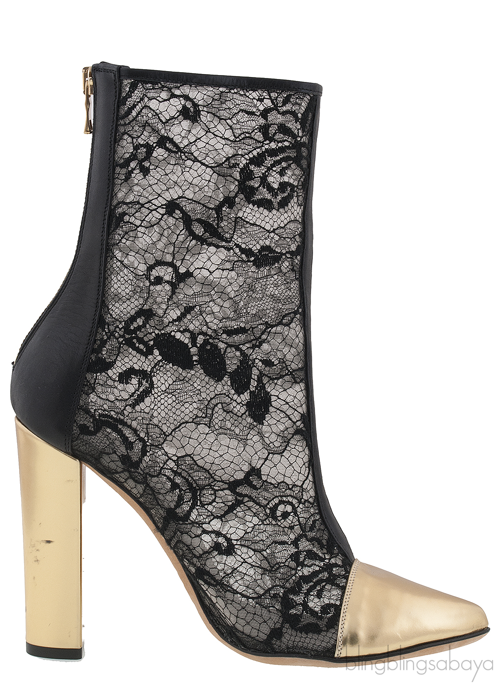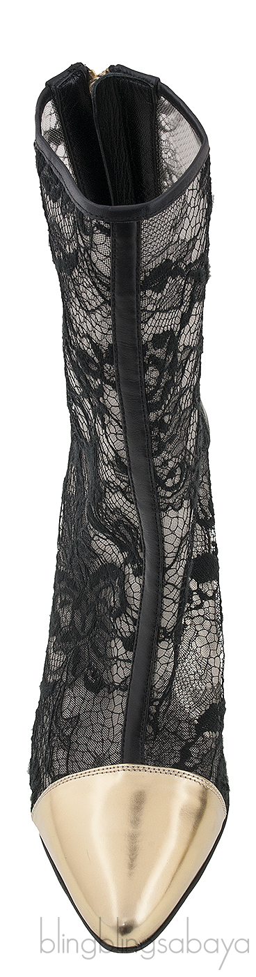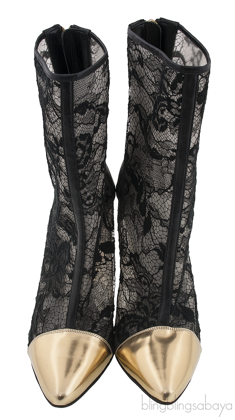 These Lace Pointed-toe Boots from Balmain are made of floral lace fabric upper with black leather trimming featuring a gold pointed toe with zip opening at rear, gold leather covered heels measuring 100 mm high, leather insole and leather sole.