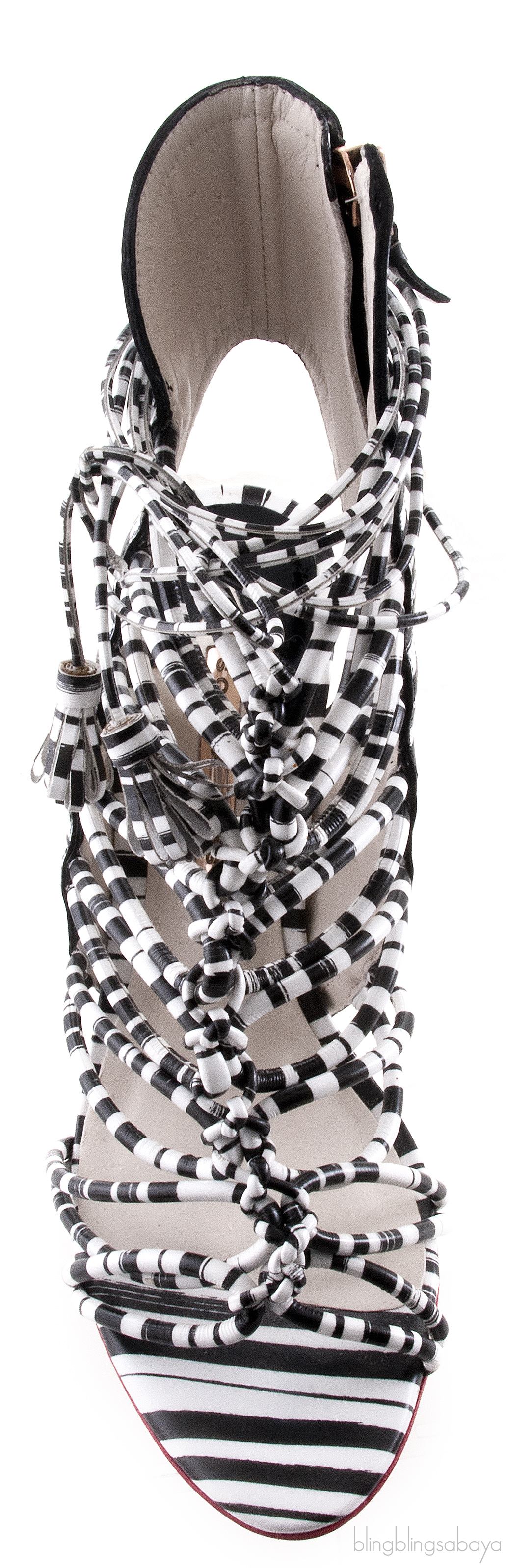 This sexy Leather Lacey Striped heels from Sophia Webster features a strappy leather booties, lifted by a streamlined heel with bold stripes and double fringe tassels for flirty fun. Leather lining and sole with padded insole and self-covered heel measuring 100mm high, side zip closure and leather sole. Made in Brazil.