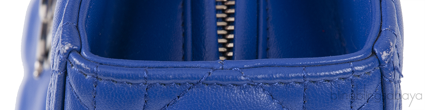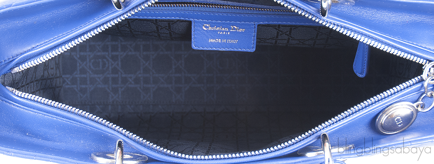 This Dior piece comes in two amazing handles and shoulder strap. The top inset zip closure opens to reveal a dark blue colored fabric lining with one zipped compartment.