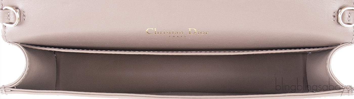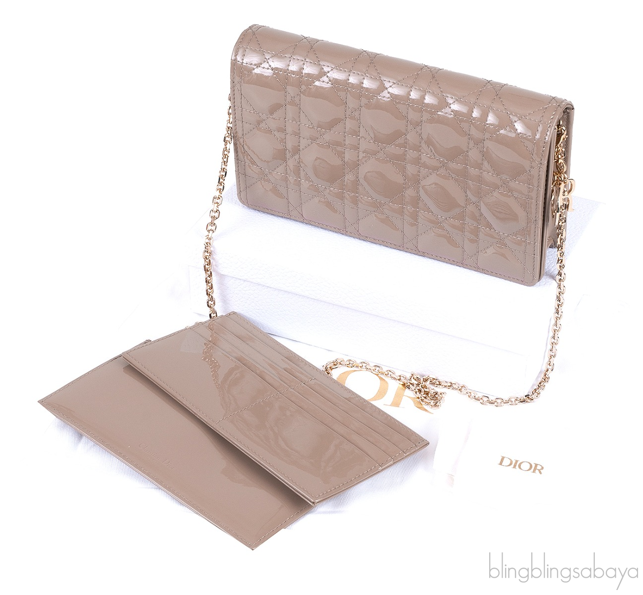 This Lady Dior Pouch Warm Taupe Patent Cannage from Christian Dior is crafted from warm taupe patent cannage leather accented with gold hardware. This pouch features a flap magnetic cover with detachable chain shoulder strap and D.I.O.R charm.