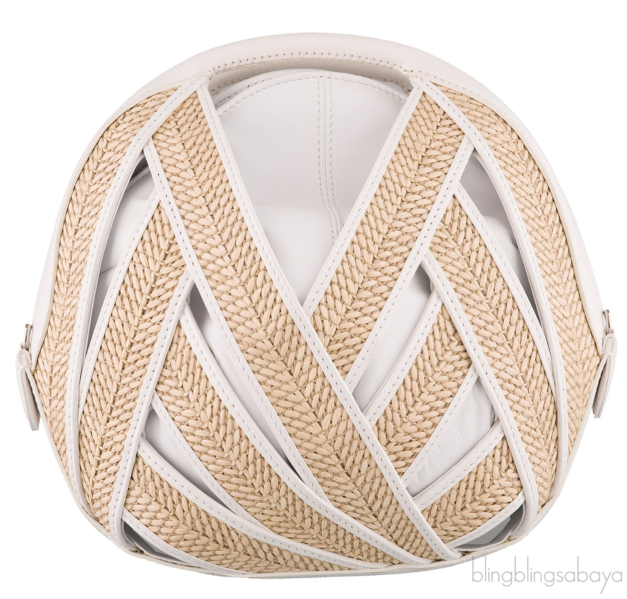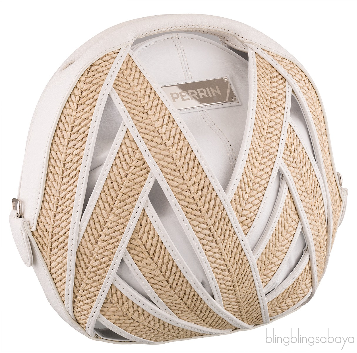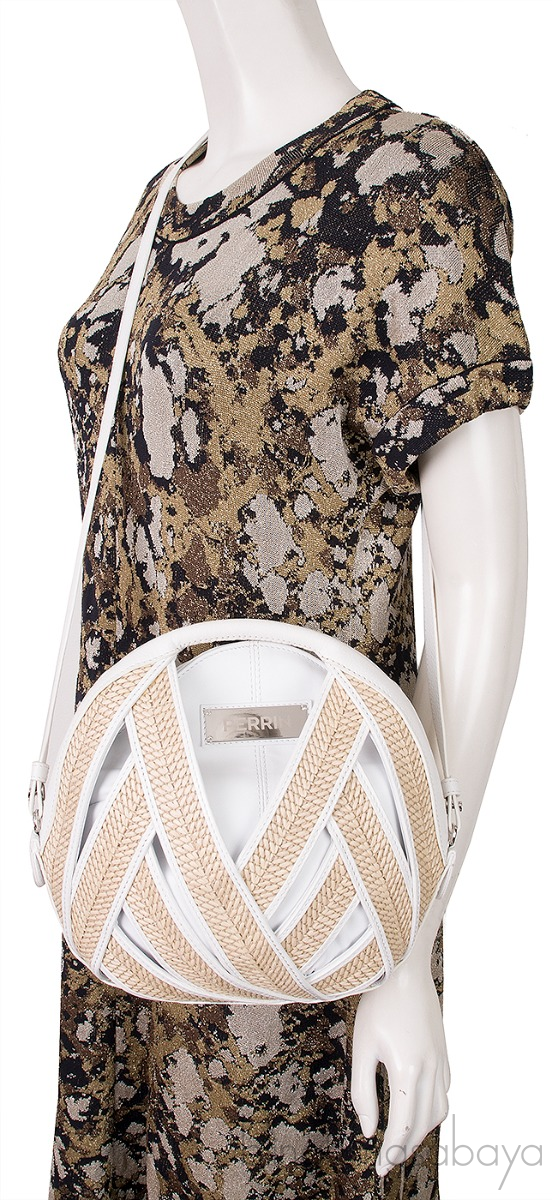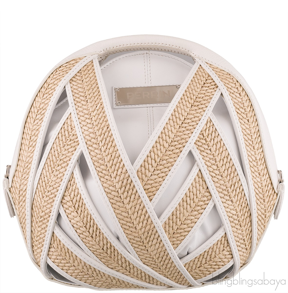 This Le Petit Panier Crossbody Bag from Perrin is crafted from white leather combine with beige raffia accented with palladium hardware. This bag features a sphere-shaped design with top handle and removable and adjustable shoulder strap.