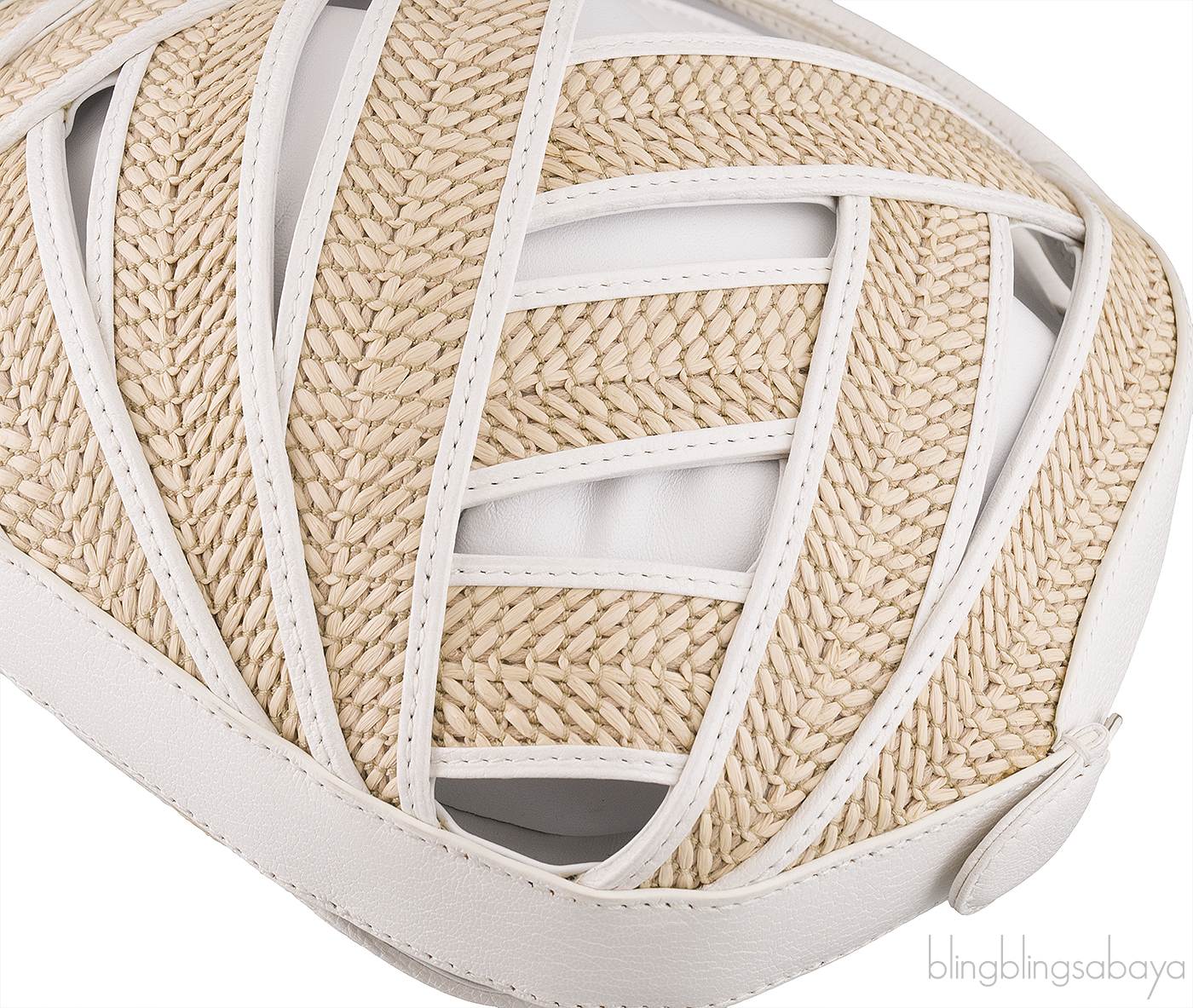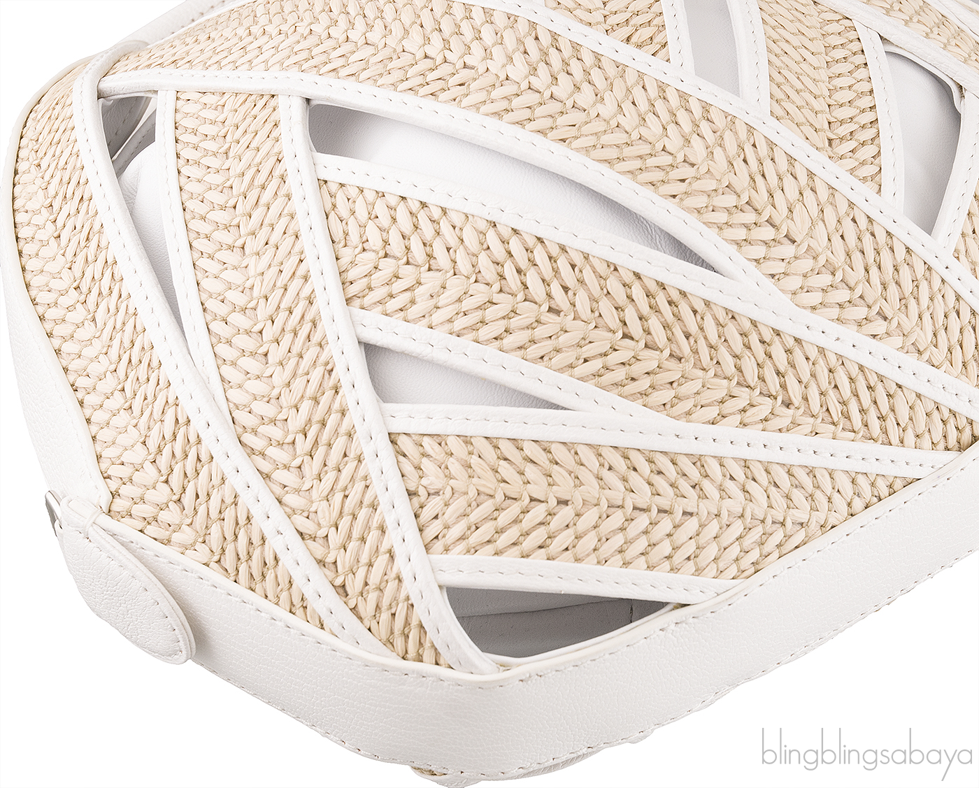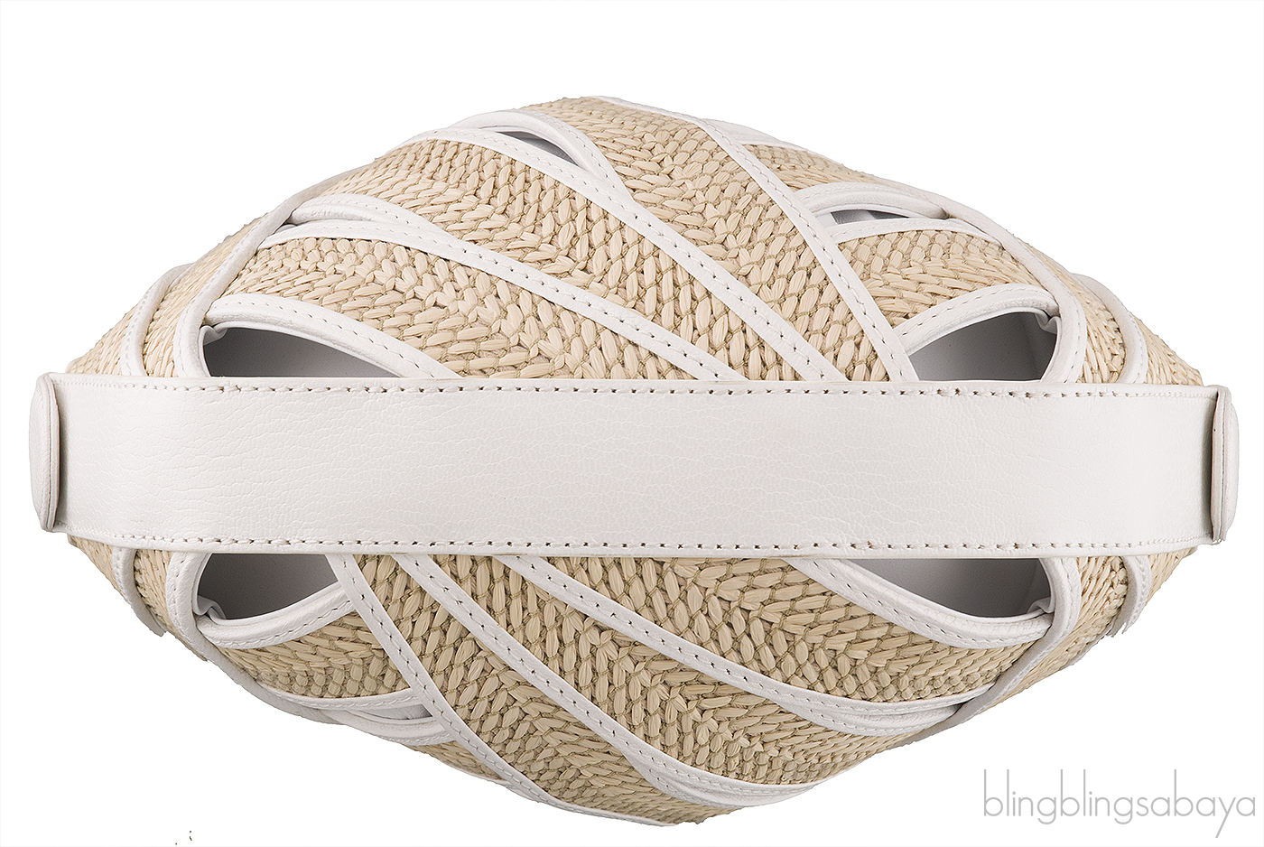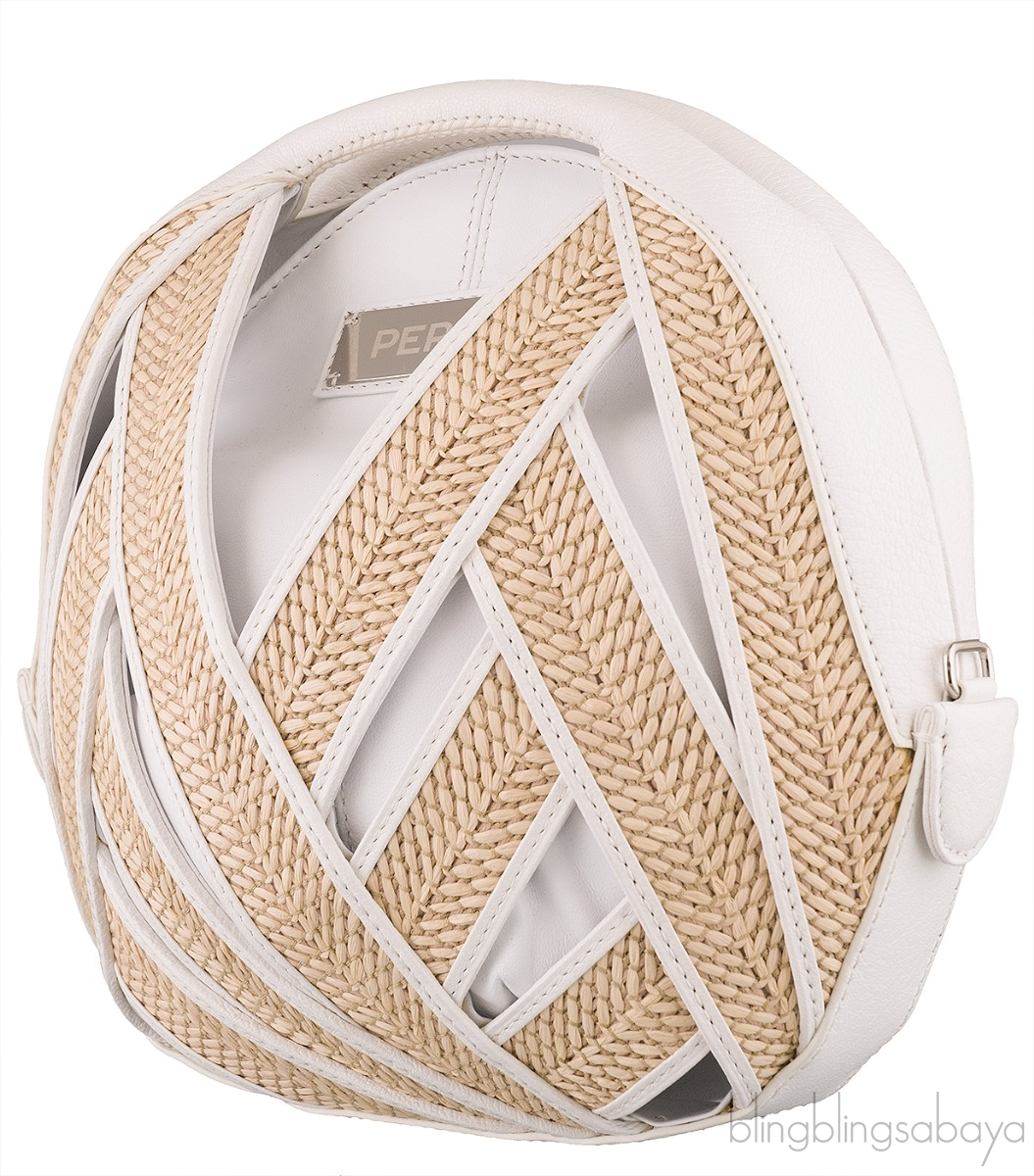 This Le Petit Panier Crossbody Bag from Perrin is crafted from white leather combine with beige raffia accented with palladium hardware. This bag features a sphere-shaped design with top handle and removable and adjustable shoulder strap.