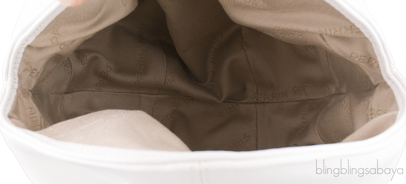 The white detachable interior of this bag has a silver logo2 plate at front with interior fully lined with fabric with one patch pocket.