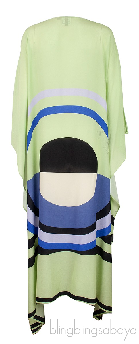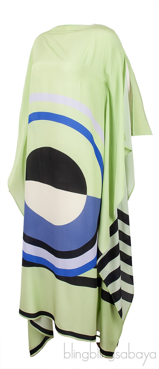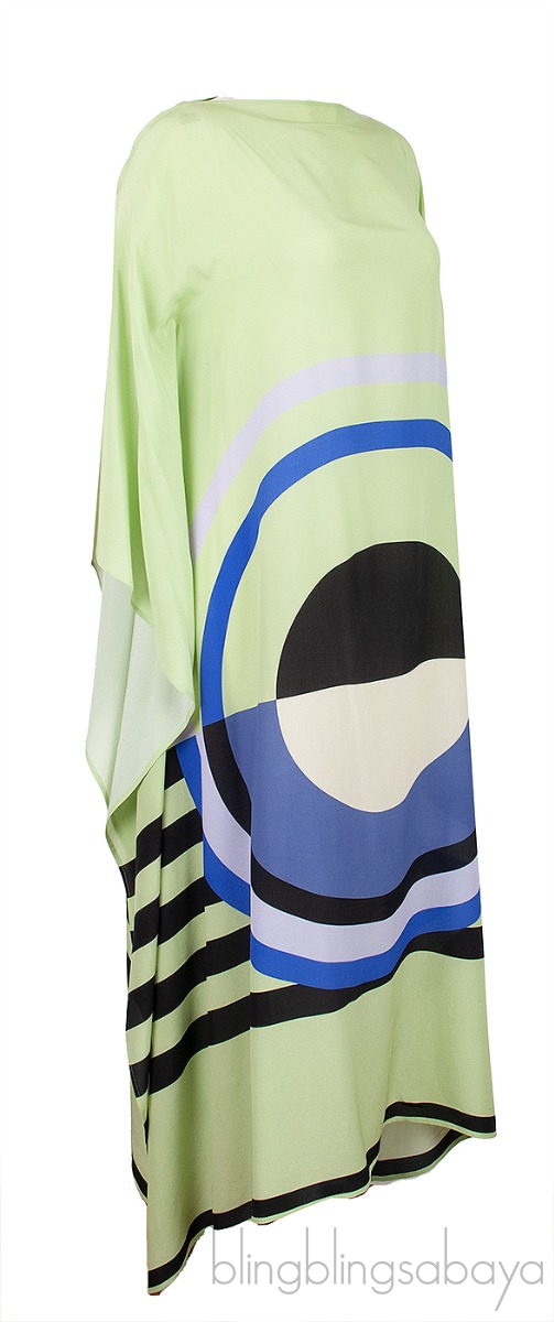 This Leaf Green Printed Silk Kaftan Dress from Louisa Paris is crafted from 100% Silk fabric. This dress is cut from fluid silk mapped with stripes and circles in bold contrasts