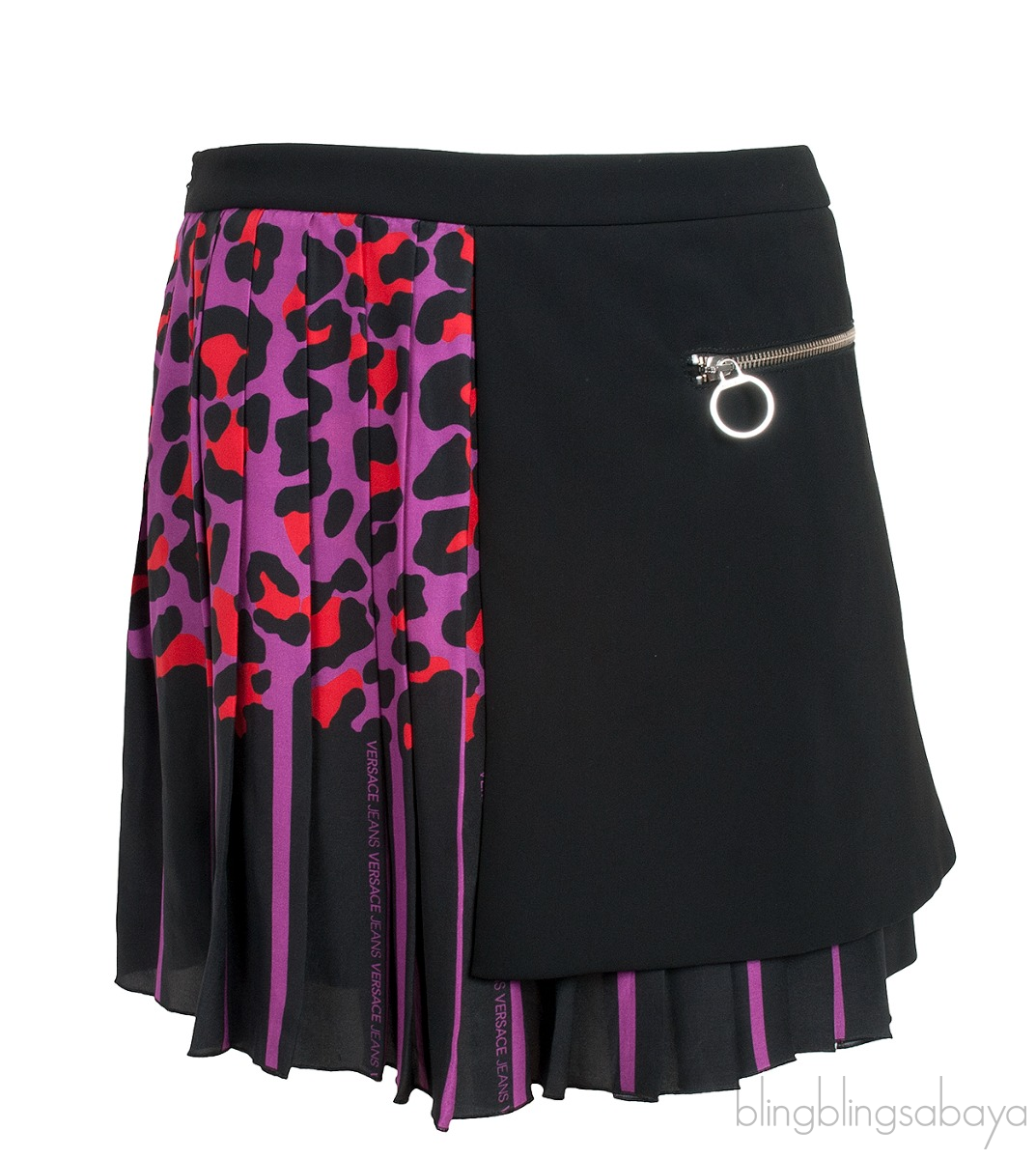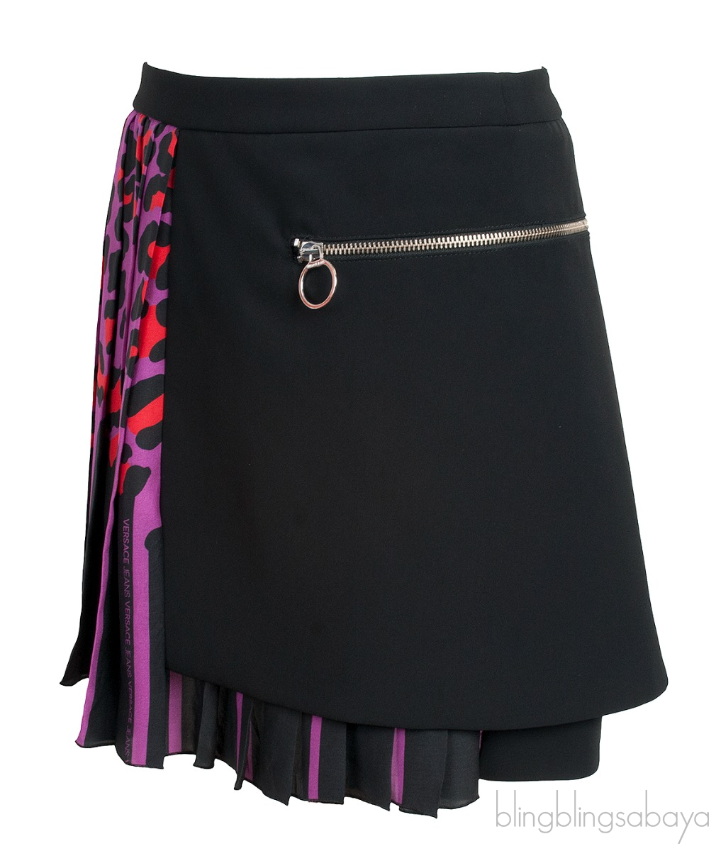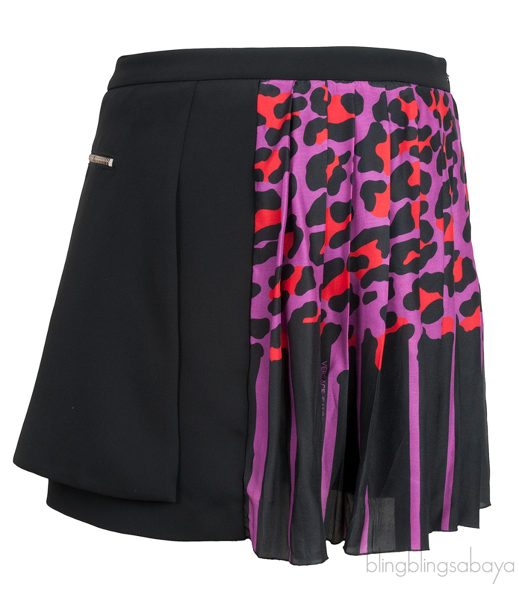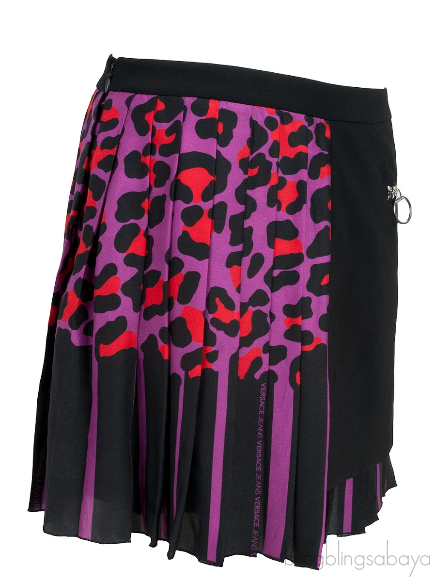 This Leopard Pleated Mini Skirt from Versace Jeans is crafted from 100% Polyester, silk & polyester. This skirt features a pleated design in red, purple and black leaopard, plain black with zip pocket on the side, zip fastening and mini length.