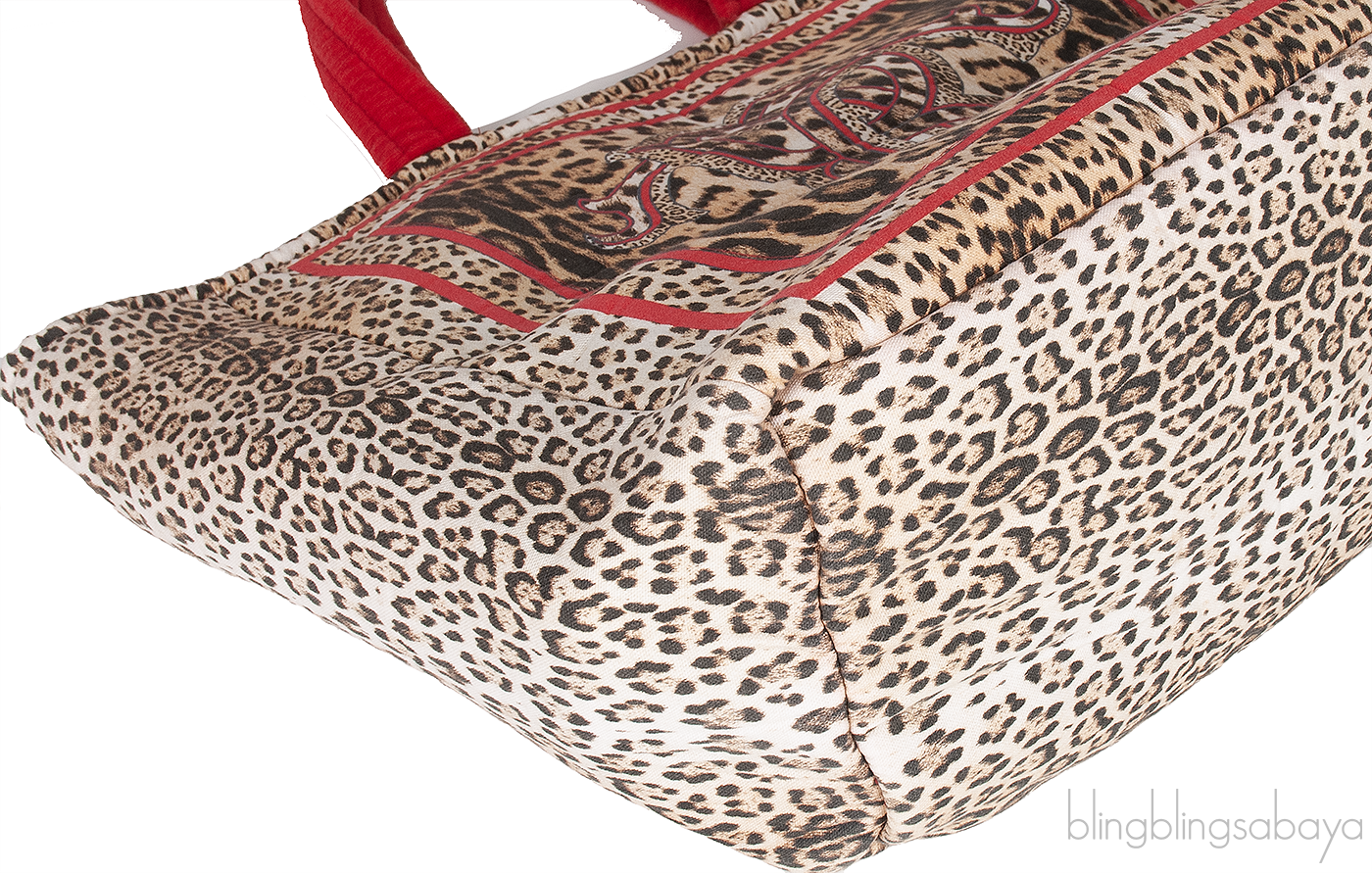 This Roberto Cavalli Leopard Print Beach Tote Bag is an ideal companion for your beach escape. Made from multicolored printed 100% Cotton fabric with a striking leopard design, it showcases a prominent RC logo2 on the front. The tote includes two red fabric top handles and an open top with no zipper, offering a spacious interior lined in matching red fabric—without any internal pockets.