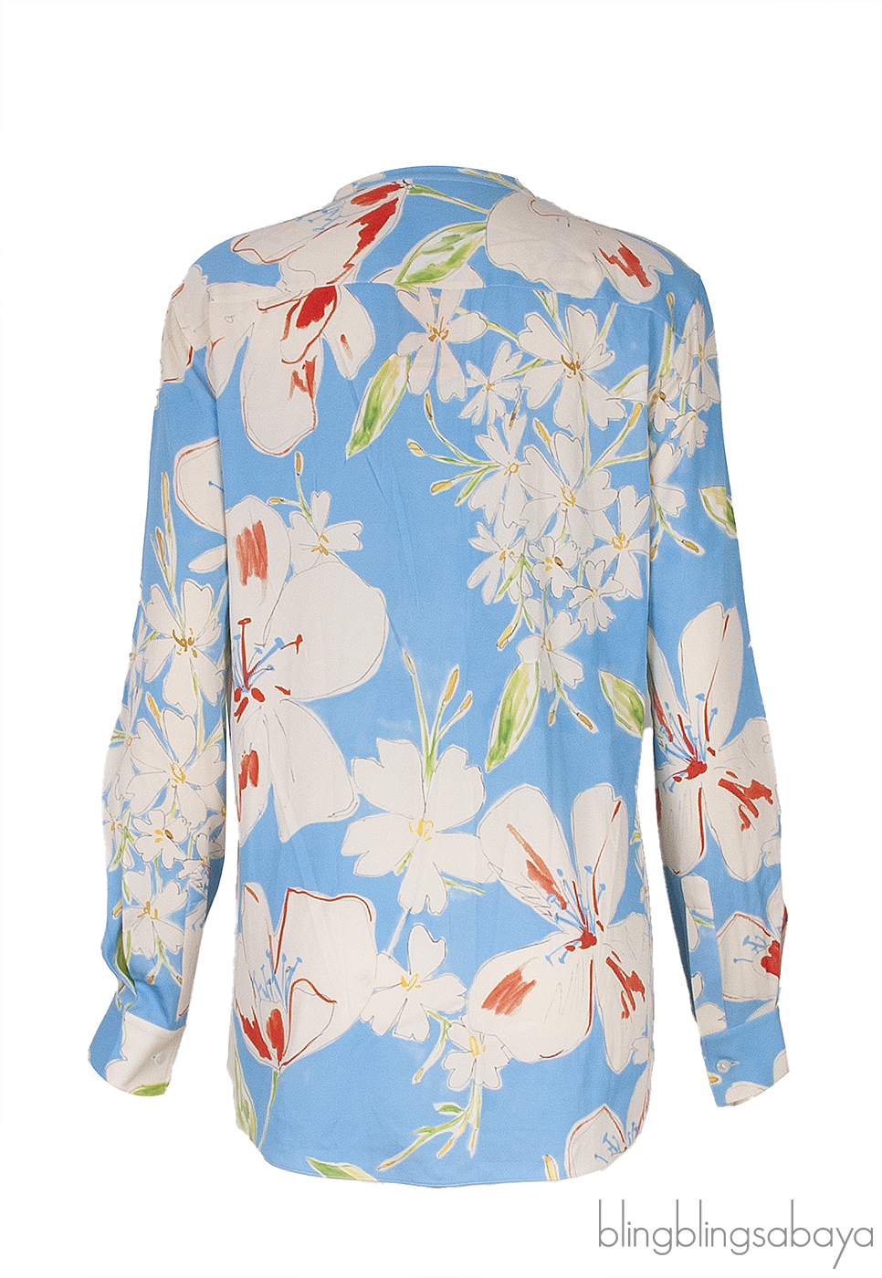 This Light Blue Floral Print Shirt from Loro Piana is crafted from 94% Silk and 6% Elastane in light blue with floral print all-over. This top features a chinese collar, button fastening through the front, long sleeves with buttoned cuffs.