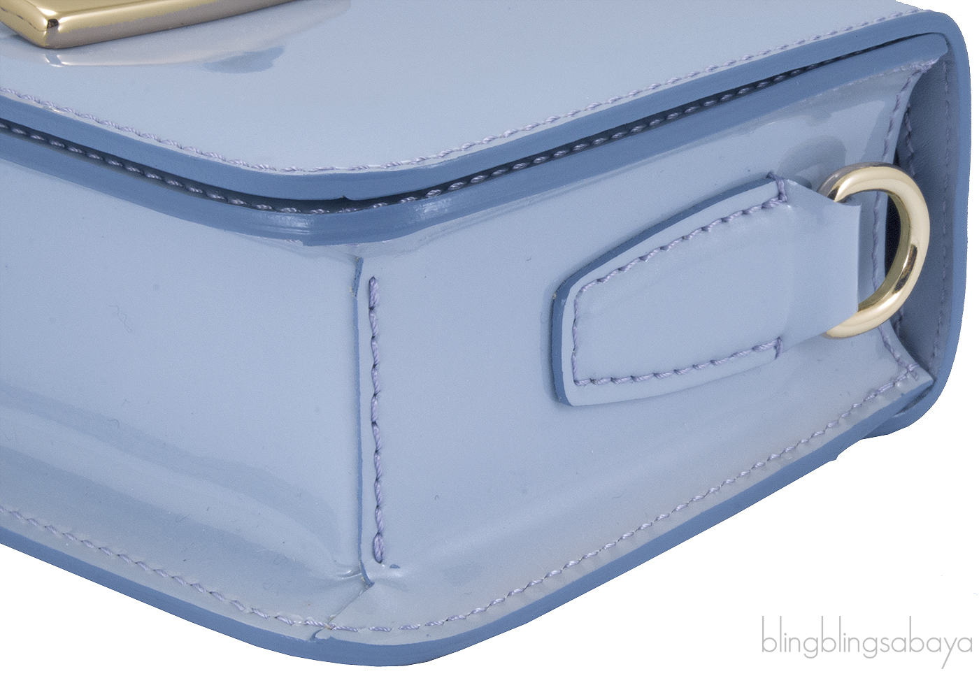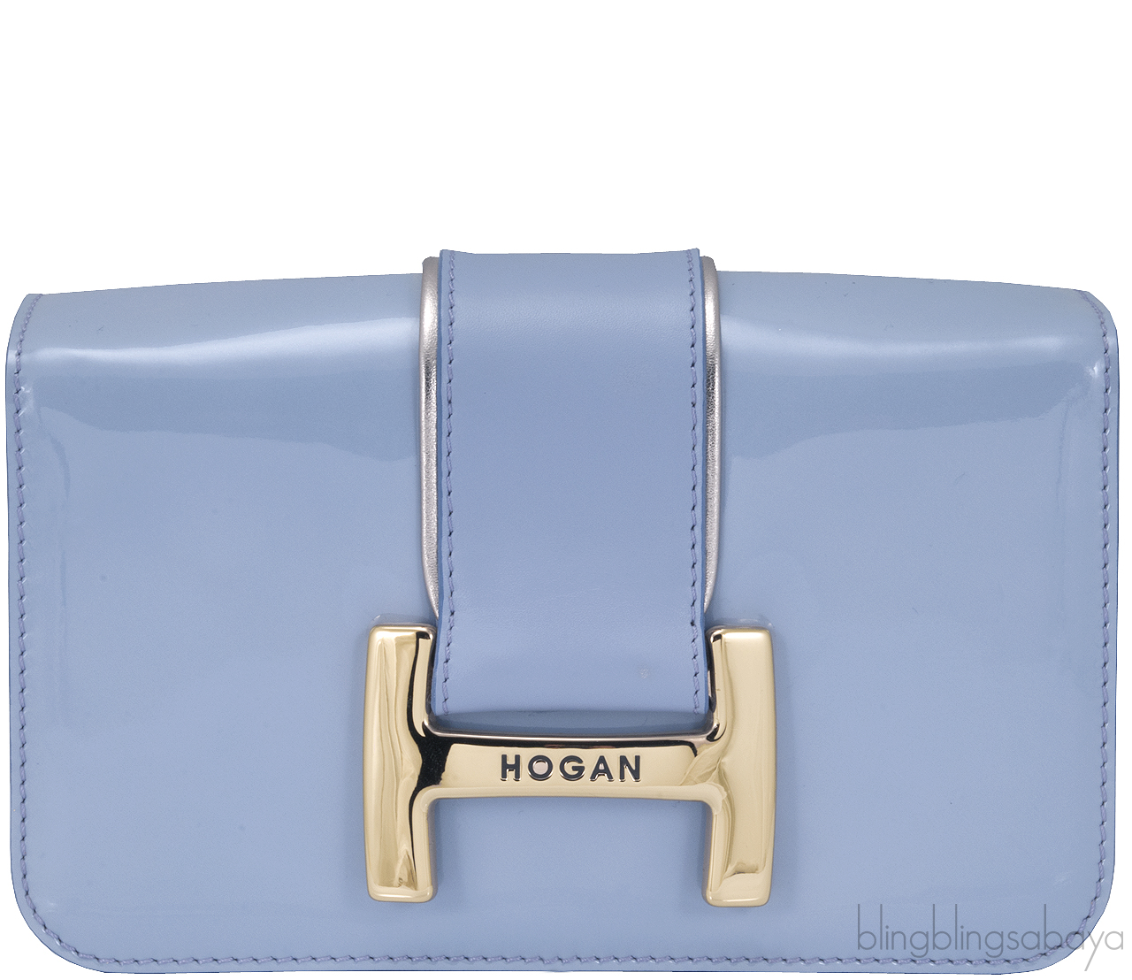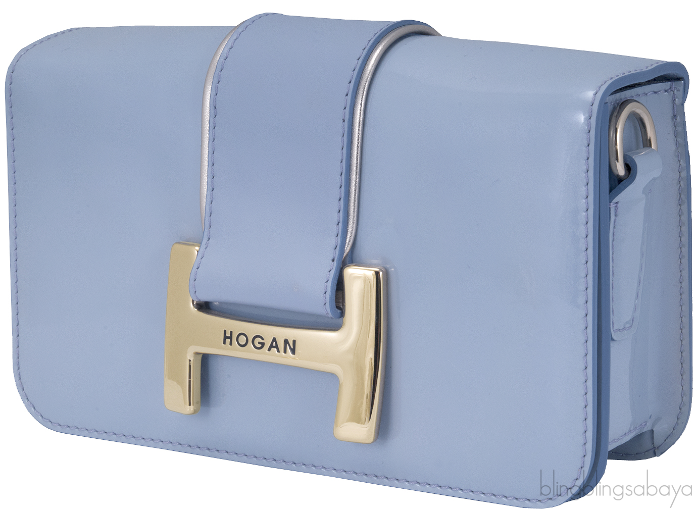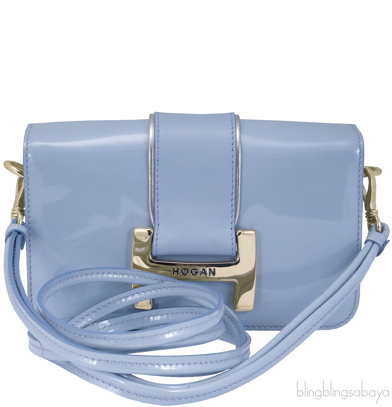This Light Blue Patent Cross-body Bag from Hogan is crafted in light blue patent leather accented with the golden hardware. This mini cross-body bag features front flap magnetic snap closure with huge "H" hard ware with brand engraved at front. This item has the size of the clutch and has detachable shoulder strap allowing the bag to use in a cross-body style. Interior is fully lined with fabric and has one slit compartment inside.