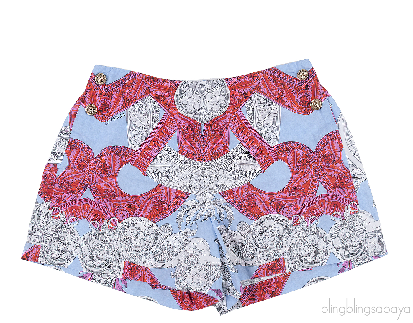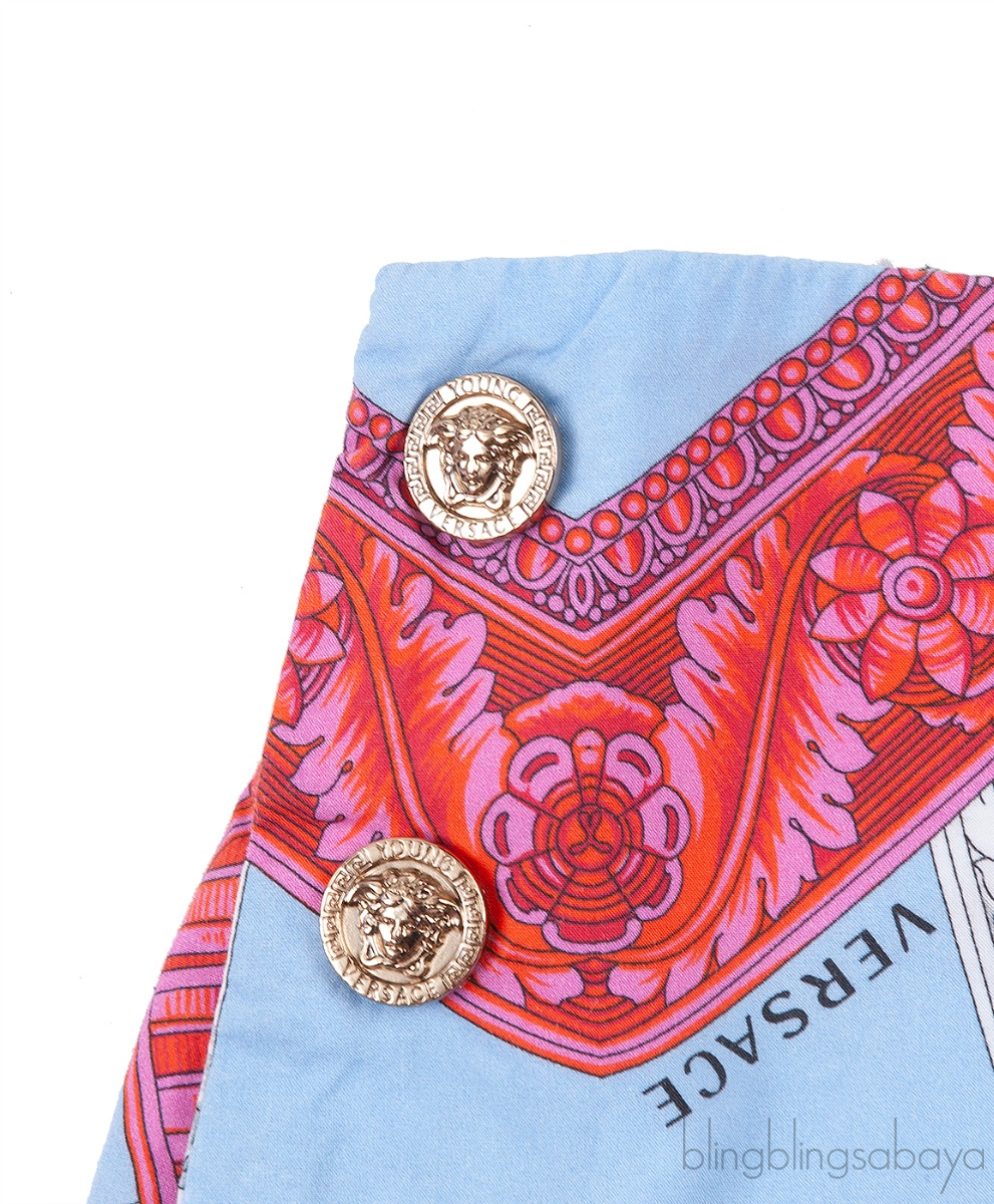 This Light Blue Printed Kids Short from Young Versace is crafted from 100% Cotton featuring a floral printed design, gold medusa head snap fastening on the side, elastic waist at back, and no pocket.