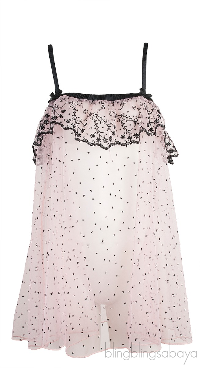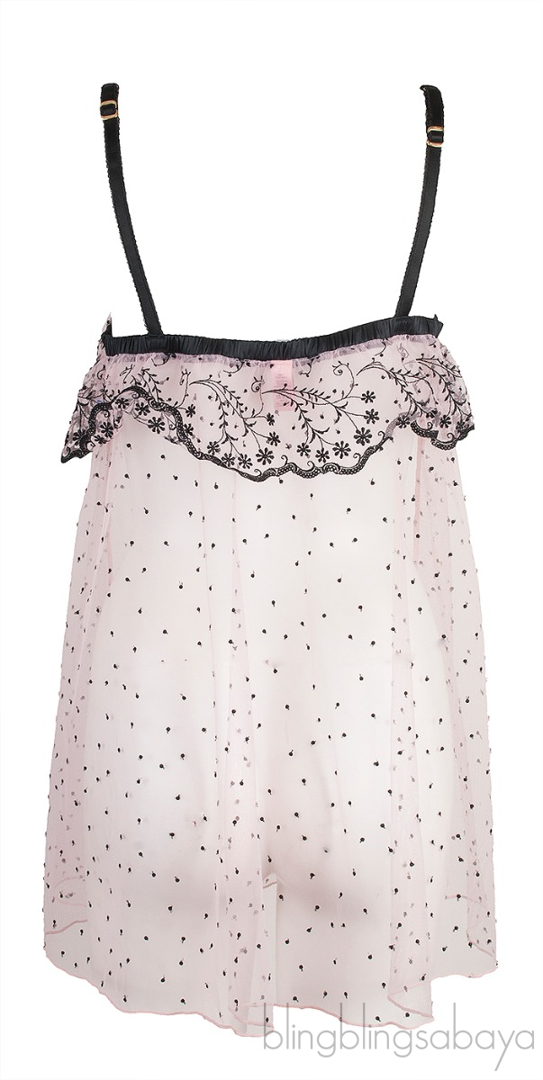 This Light Pink Mesh See-through Camisole from Agent Provocateur is made 53% Polyamide, 31% Polyester and 16% Silk fabric in light pink featuring an elastic straight neckline and shoulder strap with buckle for adjustment, scallop embroidered mesh ruffle detailing, small black bow at front and black polka-dot detailing all-over this see-through sexy camisole.