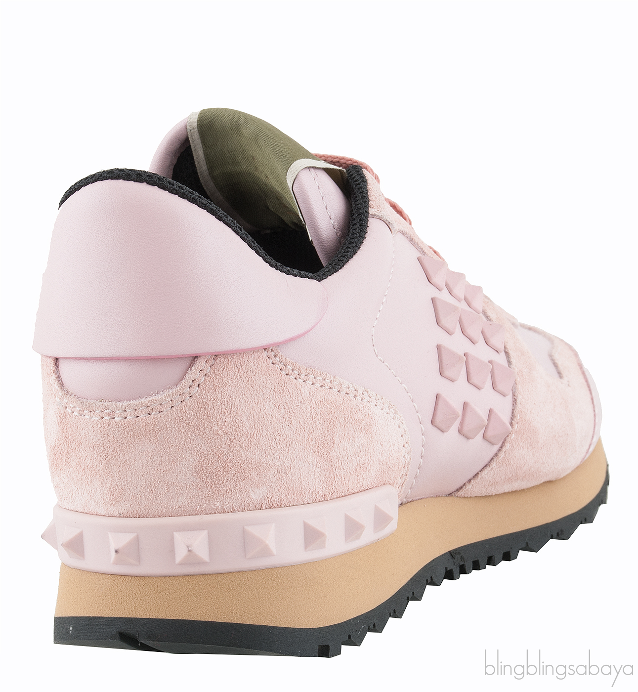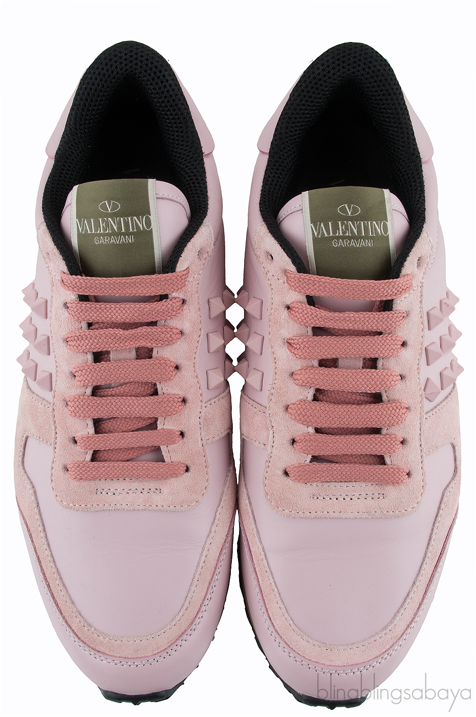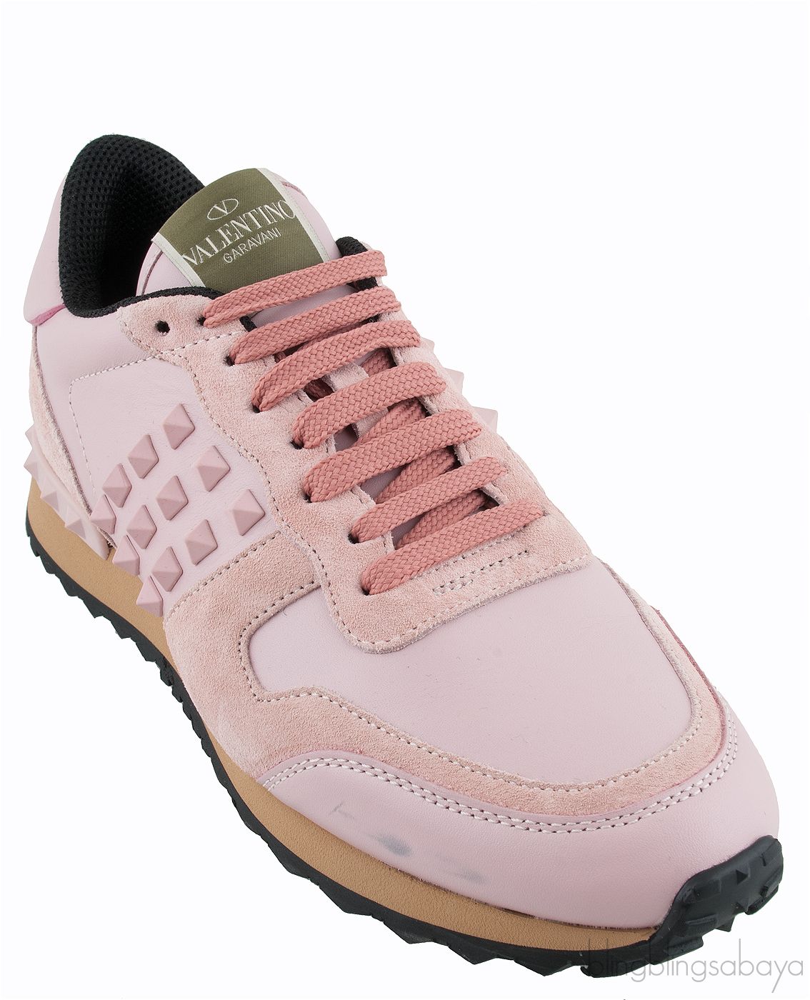 This understated kicks Rockrunner Sneakers from Valentino is crafted from leather Uppers in light pink volor. This features a coordinating suede overlays to build up the luxe design; fitted with the house's iconic rockstuds across the sidewalls and heel, eight pair of eyelets and old rose shoe laces, Interior is lined with black fabric and rubber sole