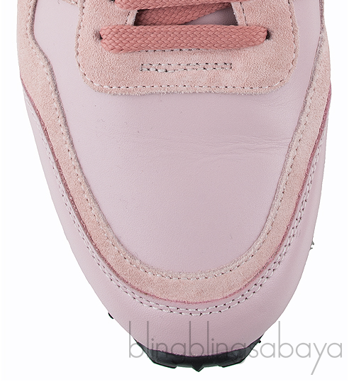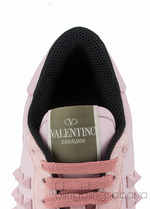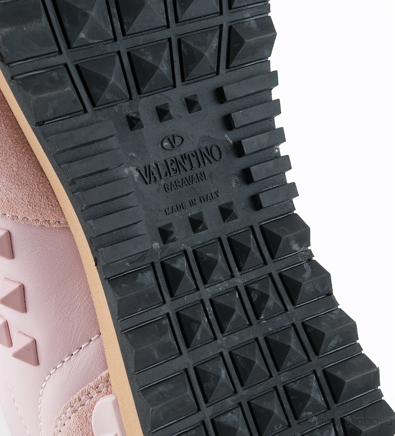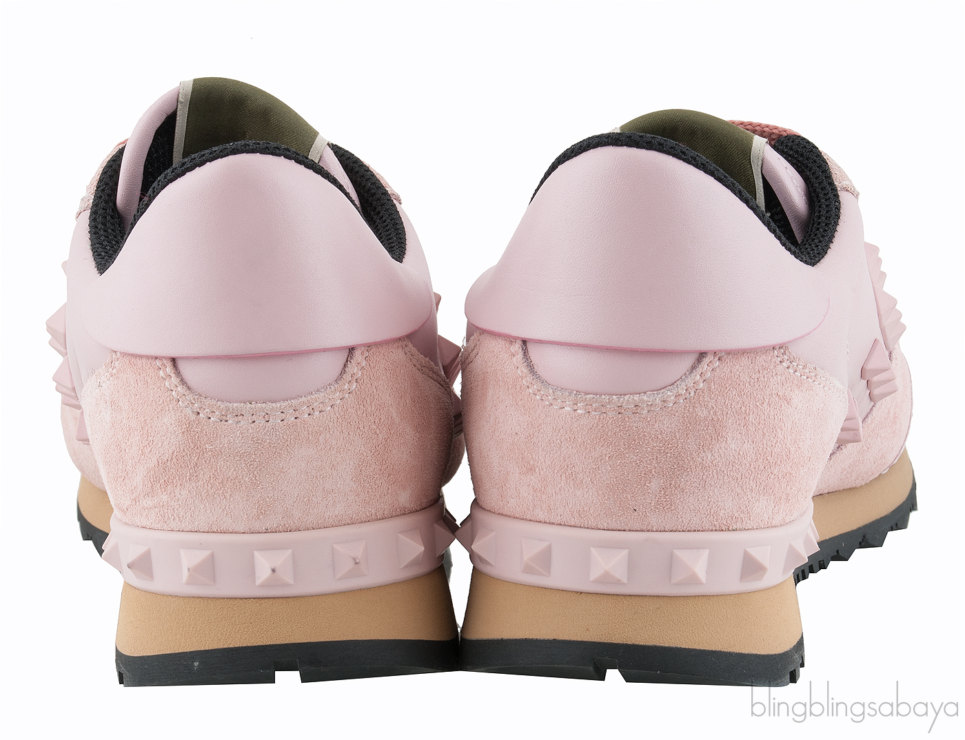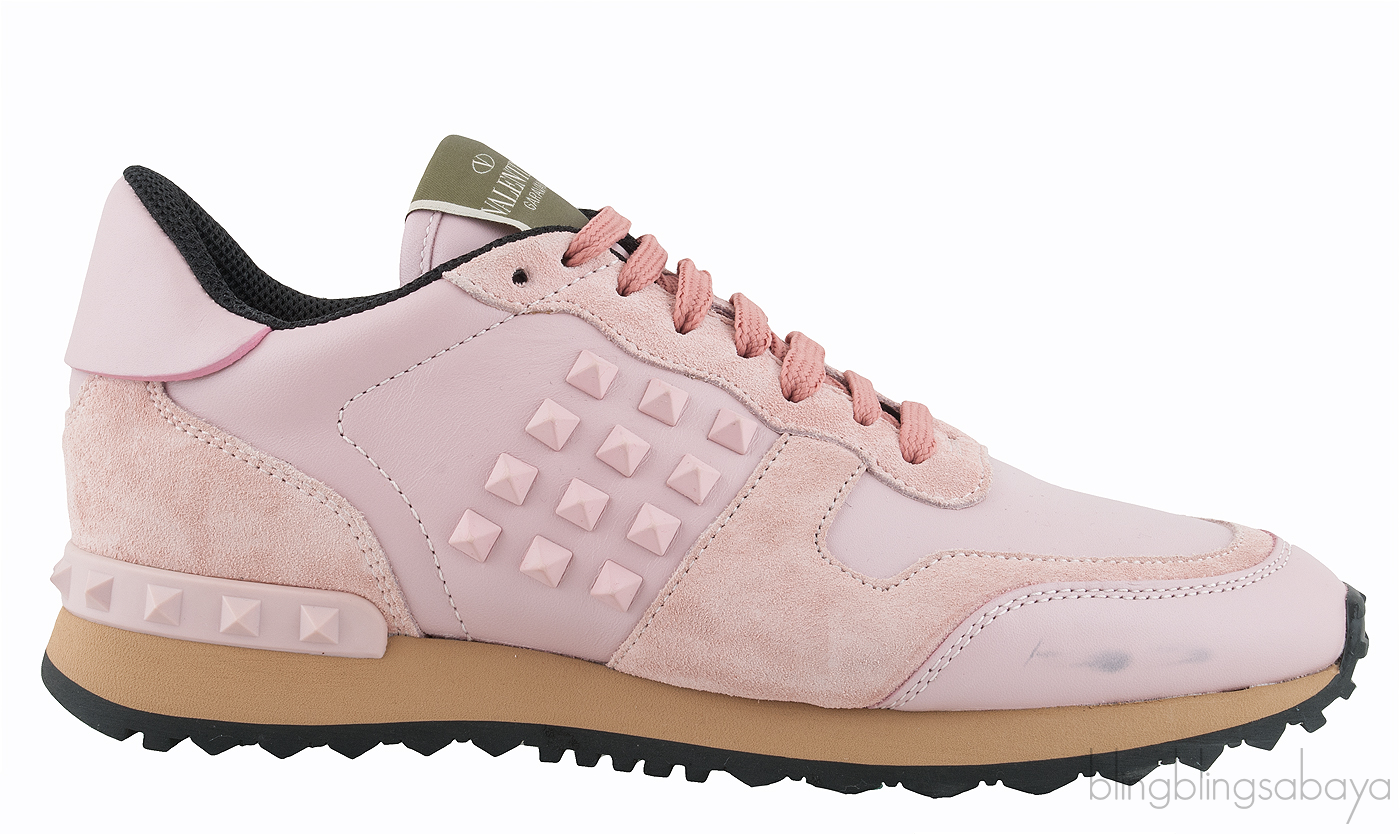 This understated kicks Rockrunner Sneakers from Valentino is crafted from leather Uppers in light pink volor. This features a coordinating suede overlays to build up the luxe design; fitted with the house's iconic rockstuds across the sidewalls and heel, eight pair of eyelets and old rose shoe laces, Interior is lined with black fabric and rubber sole