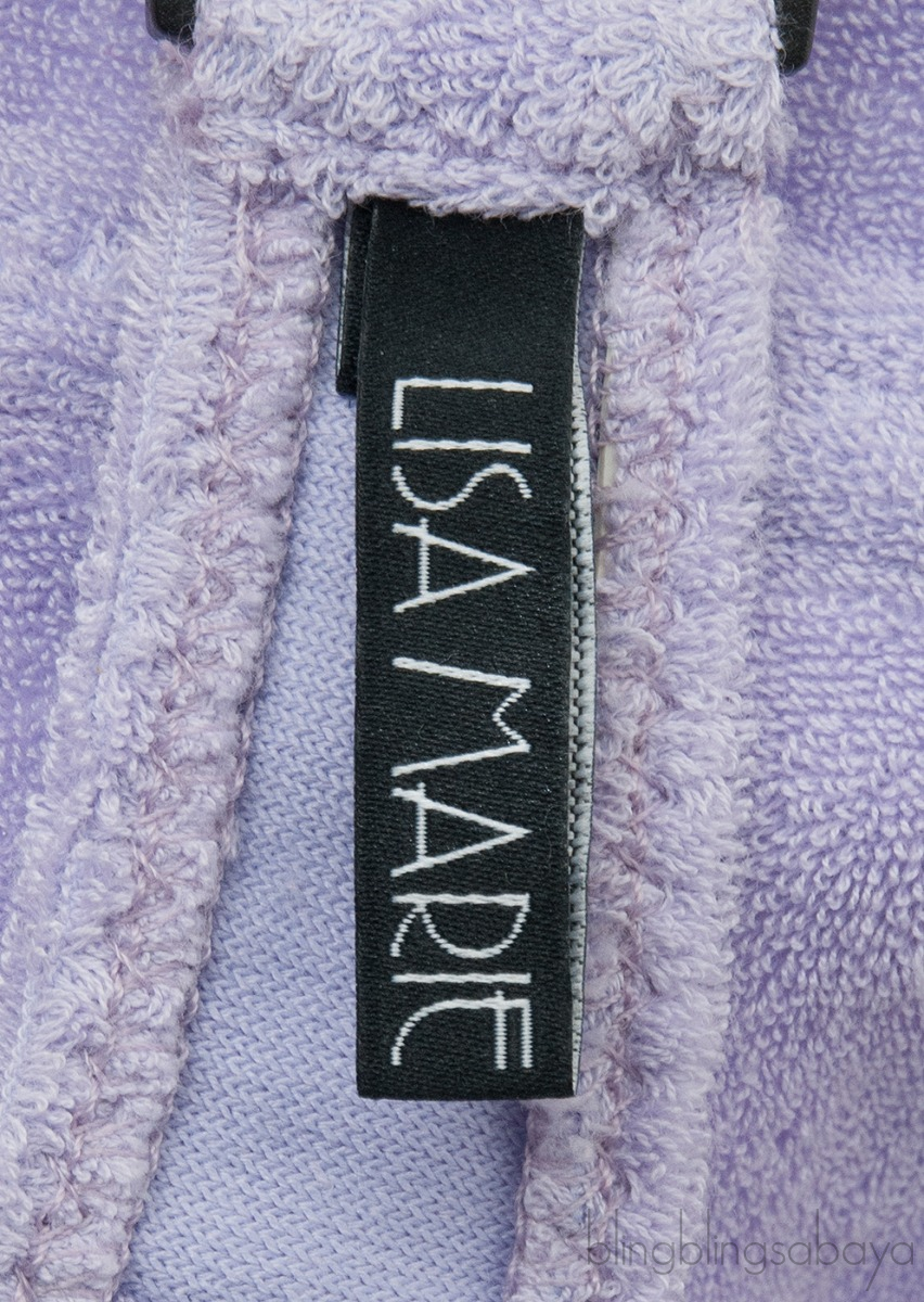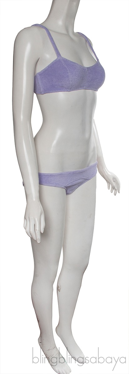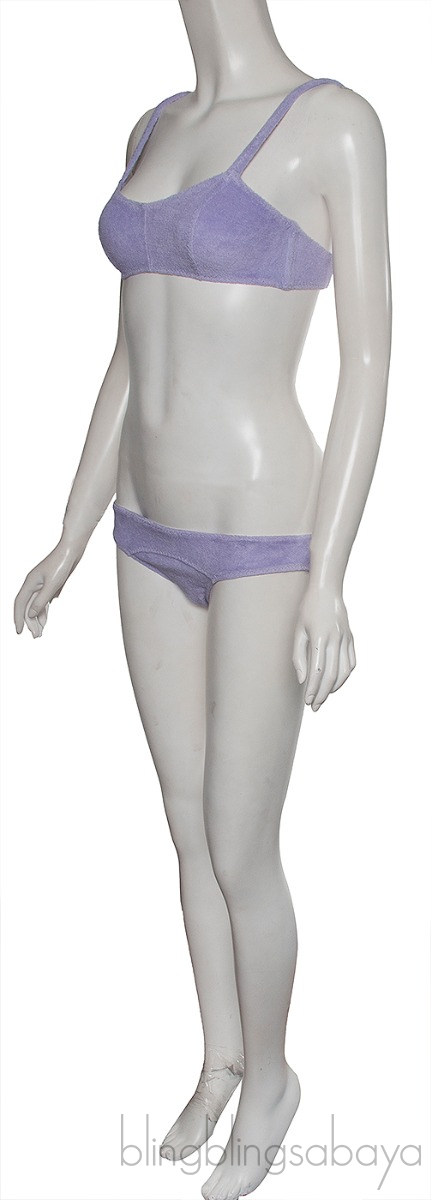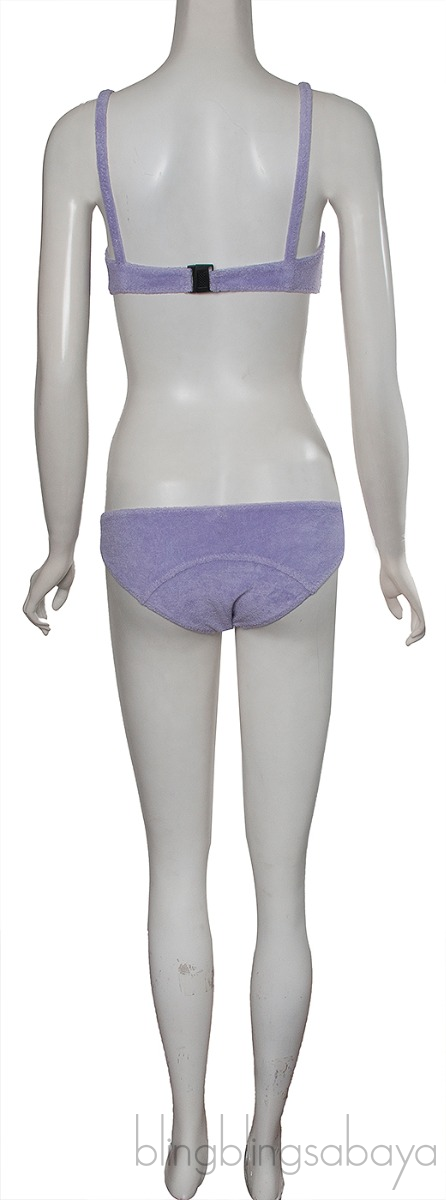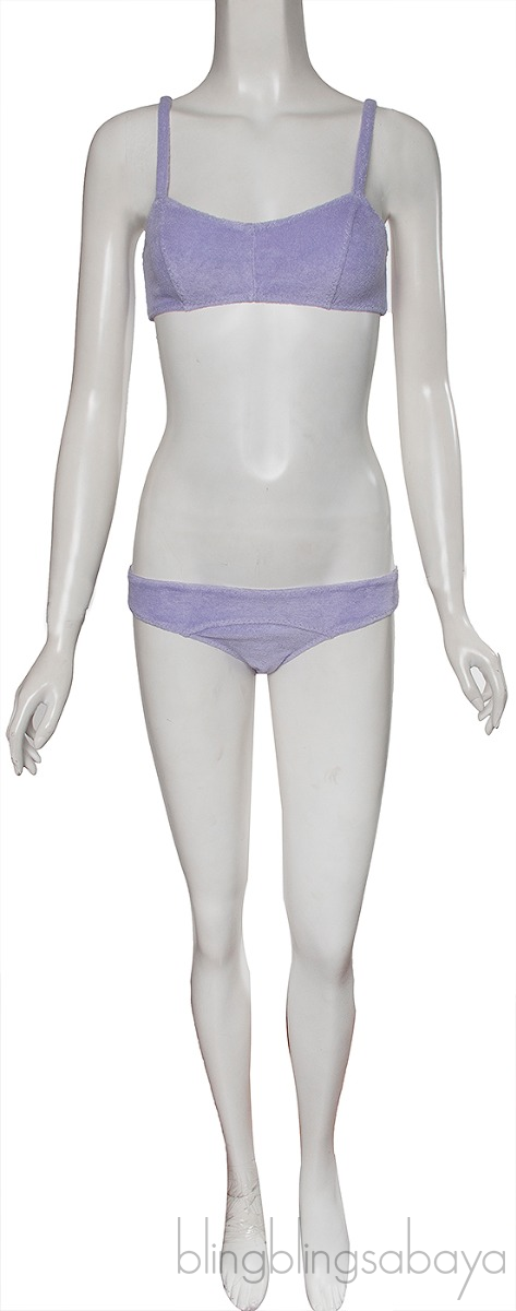 This Stretch Lilac Bikini & top from Lisa Marie Fernandez is made of 84% Cotton and 16% Polyester terry cloth fabric in lilac color. Top features a black push lock closure at back, non-padded and pair with bikin bottom