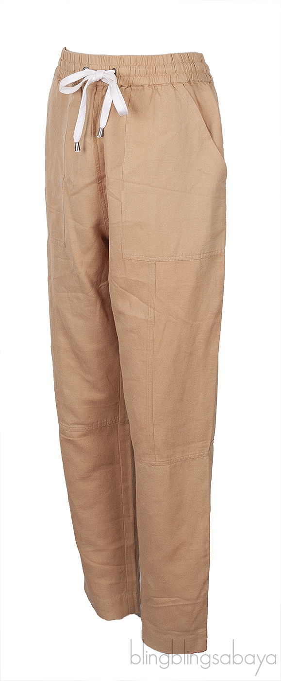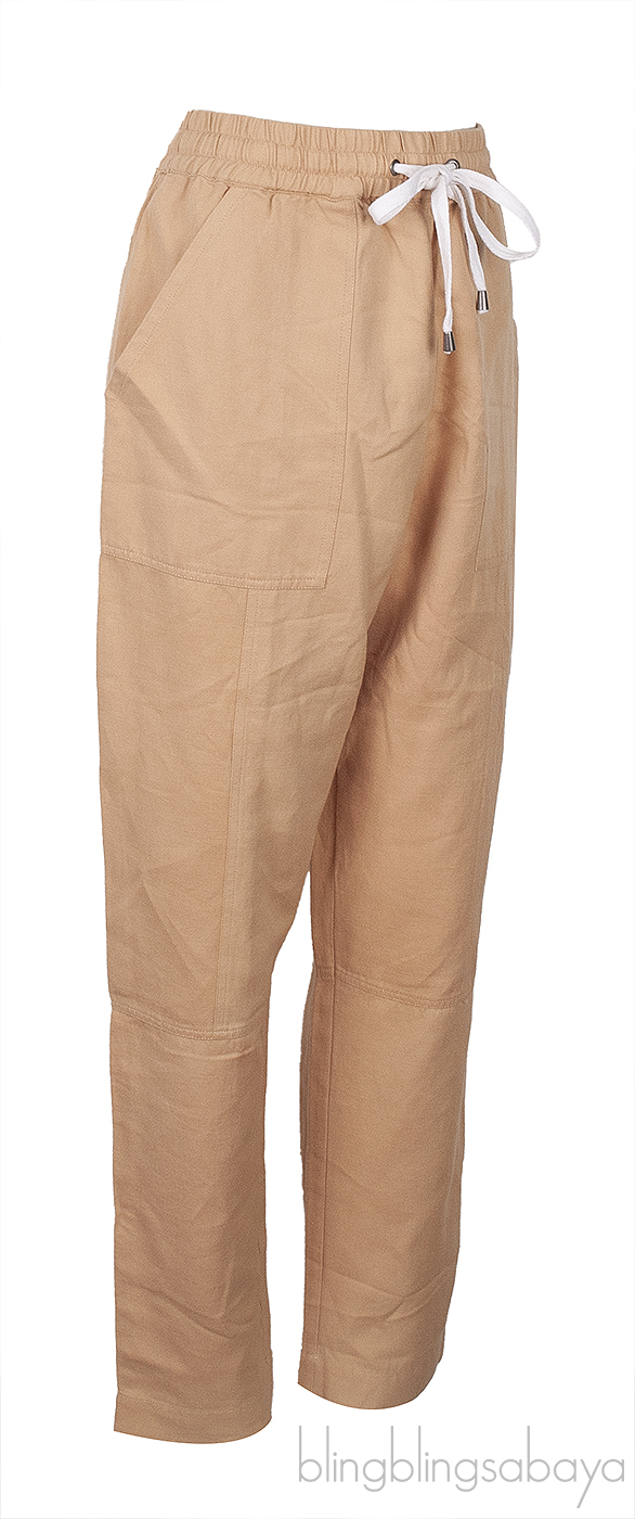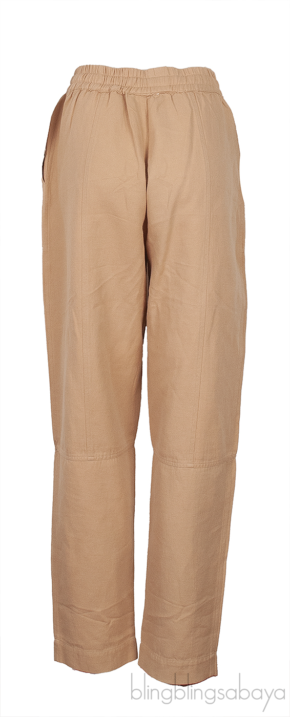This Brown Trouser from Apiece Apart is made from 60% Linen and 40% Cotton. This trouser in brown fabric features an elastic waist with drawstring, two front slant pockets, and high rise cut.