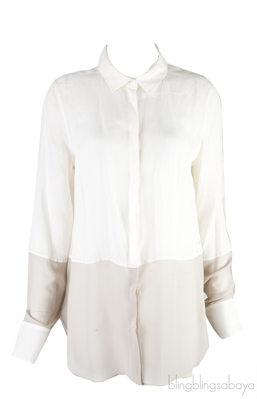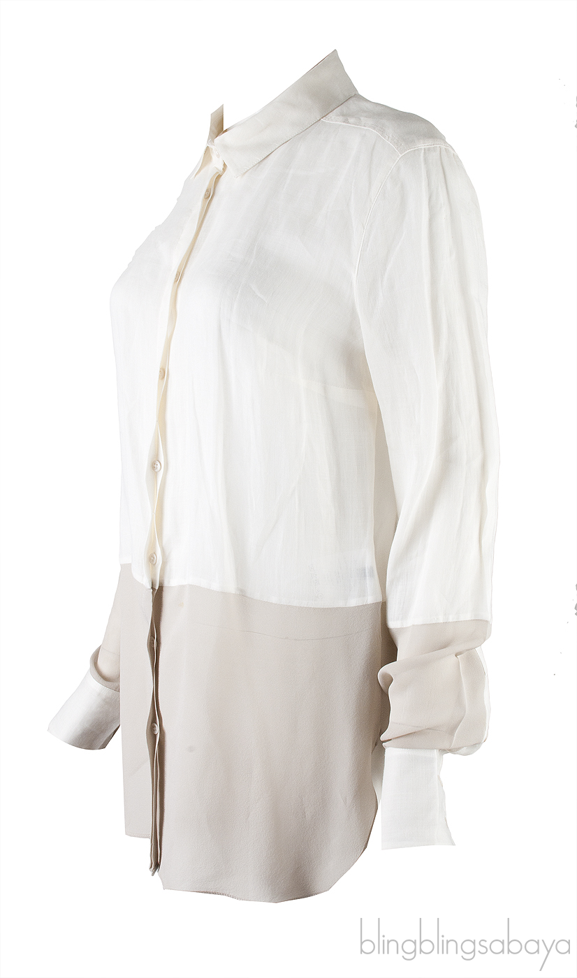 This Bi-color Long Sleeve Shirt from Joseph is crafted from 100% Ramie fabric and 100% silk in off-white and beige. This shirt features long sleeve with button cuffs, classic collar, button fastening to the front, and round hemline.