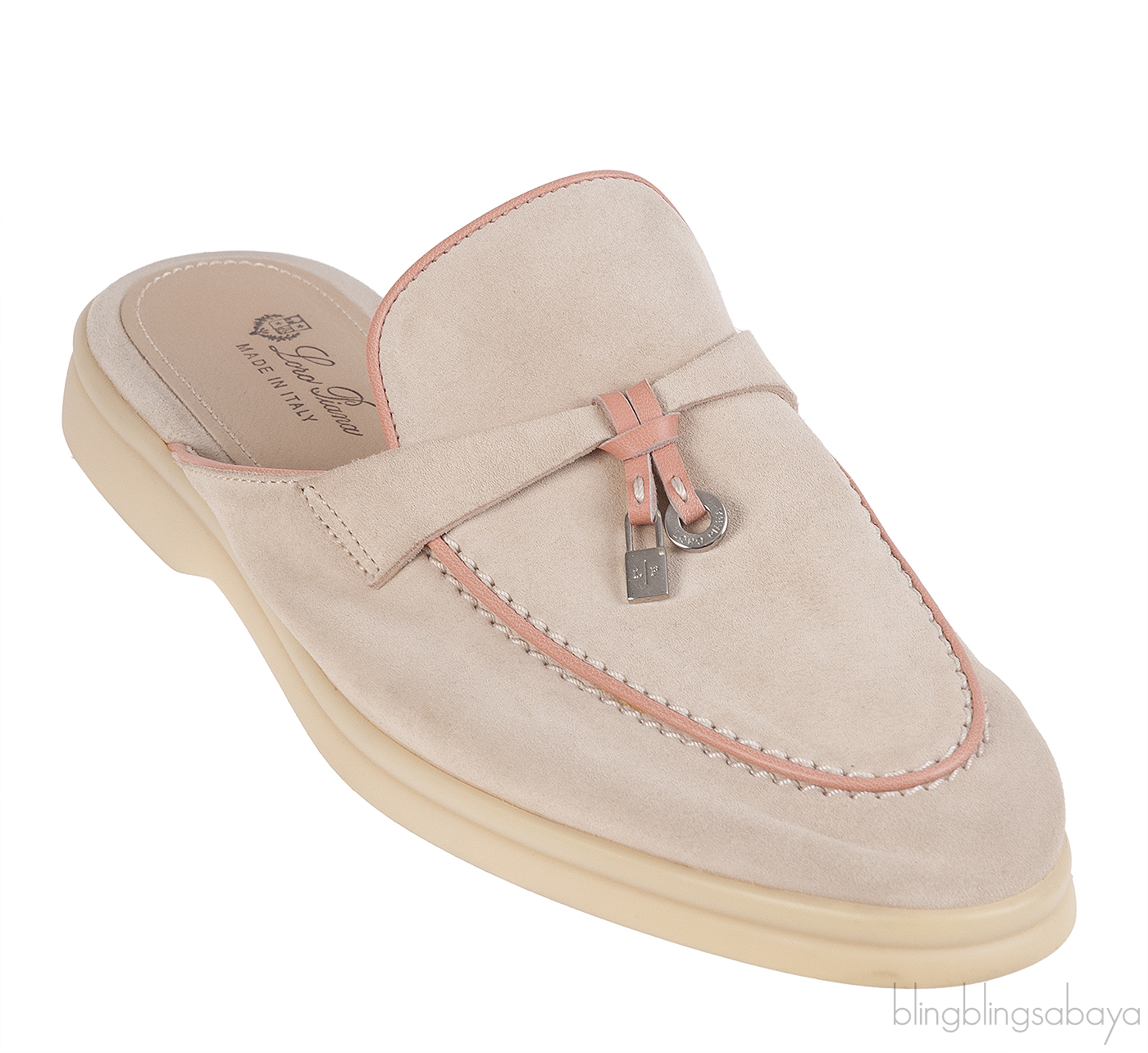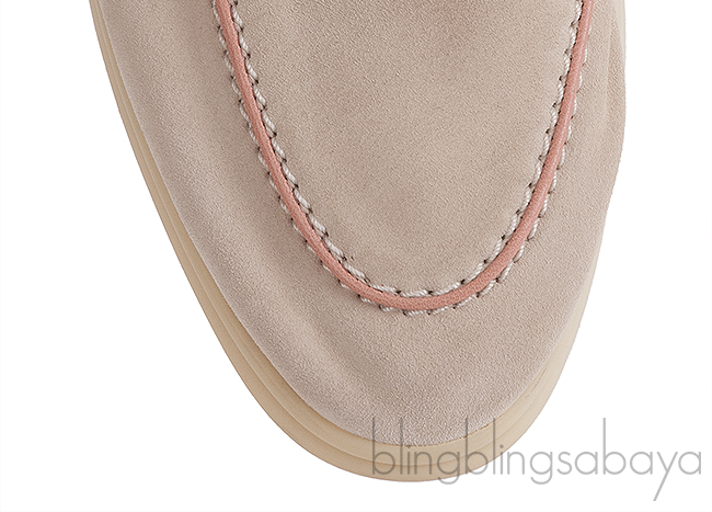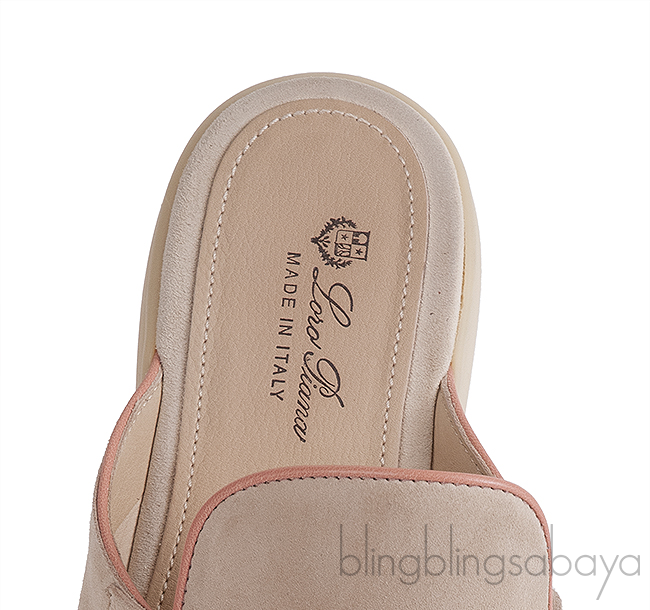 This pair Loro Piana Babouche Charms Walk Loafers Beige Pink Mules expertly crafted from unlined suede with a light water-repellent and stain-resistant finish, it offers both elegance and practicality. The design is enhanced by a contrasting pink leather piping and signature band adorned with *Loro Piana My Charms*, while the leather insole and flexible rubber sole ensure exceptional comfort and ease of wear.