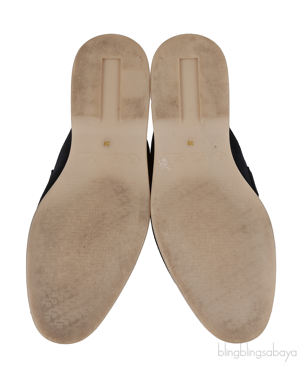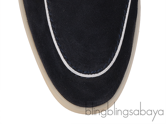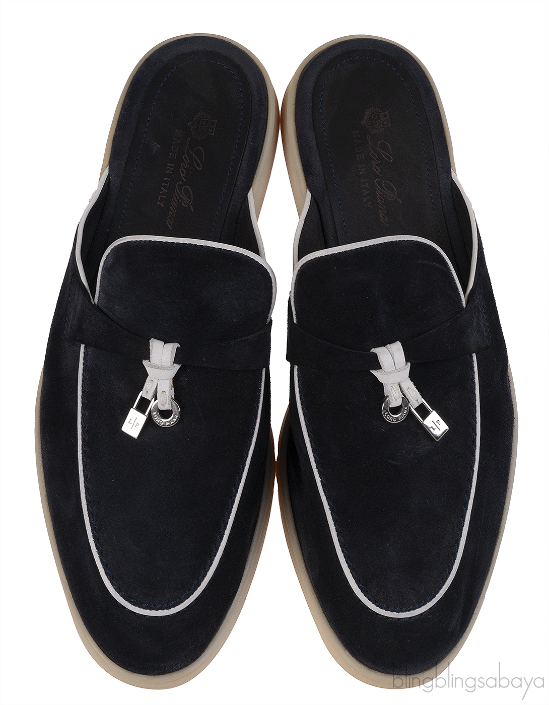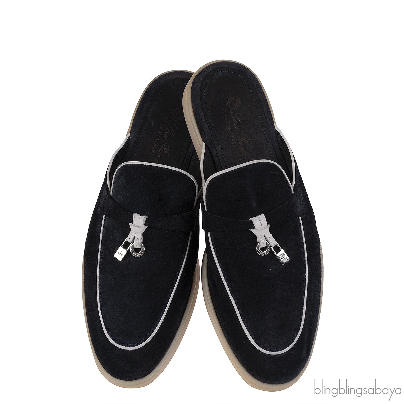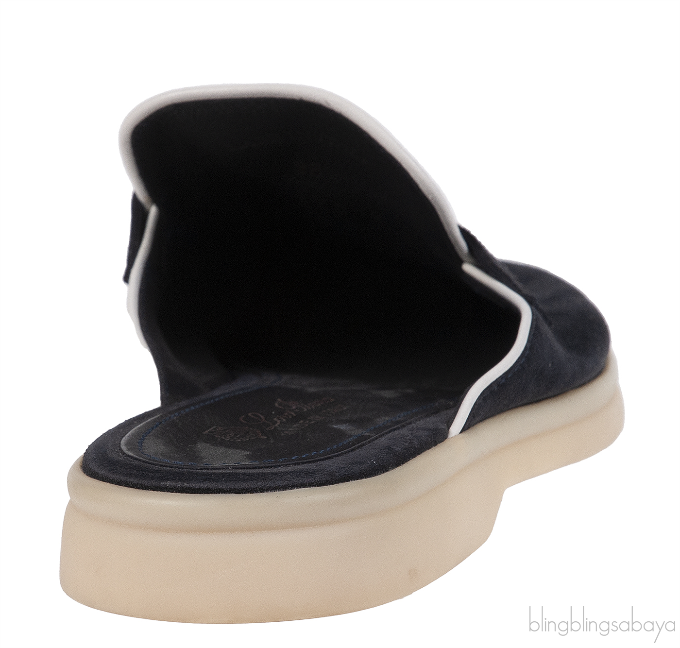 This pair Loro Piana Charm Walk Babouche Suede Black Mules expertly crafted from unlined suede with a light water-repellent and stain-resistant finish, it offers both elegance and practicality. The design is enhanced by a contrasting white leather piping and signature band adorned with Loro Piana My Charms , while the leather insole and flexible rubber sole ensure exceptional comfort and ease of wear.