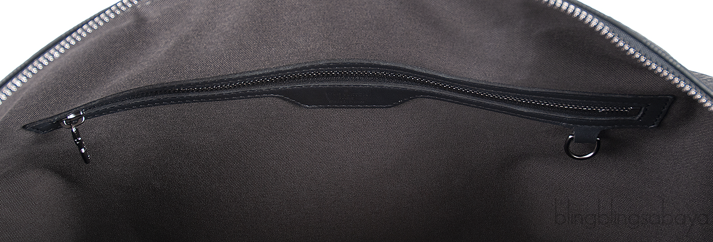 This bag features two top leather handles and has removable and adjustable canvas shoulder strap that allows the bag to carry in a horizontal way. The top zip opening gives access to roomy interior lined with gray fabric revealing one main interior compartment with 2 patch pockets.