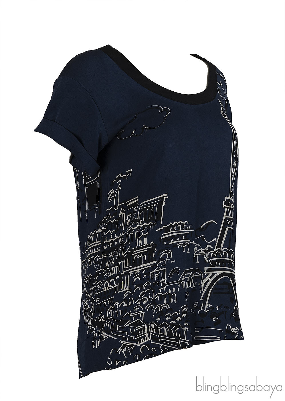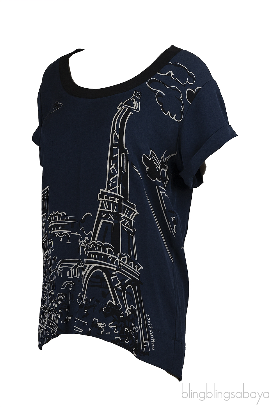 This Louis Vuitton Blue Paris Print Top is crafted from 100% Silk Fabric in blue hue with Eiffel Tower Paris print motif featuring a round neckline, short sleeves, and pull over.