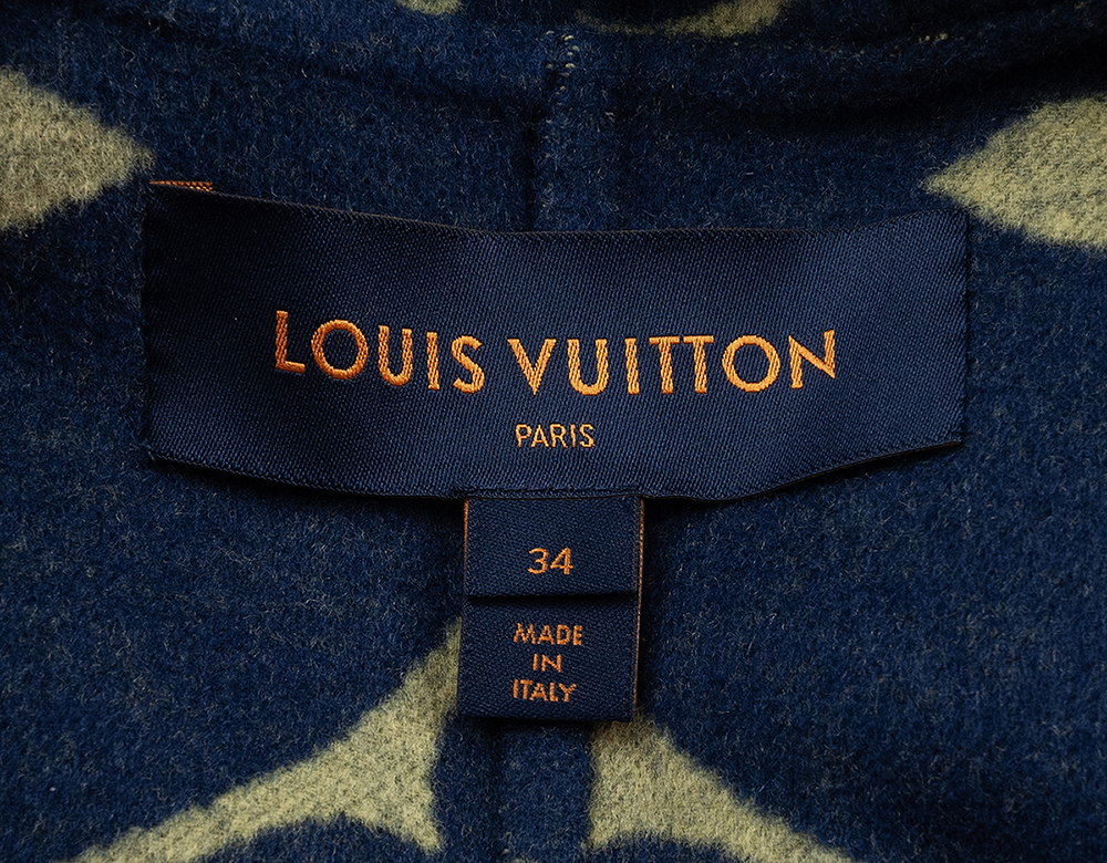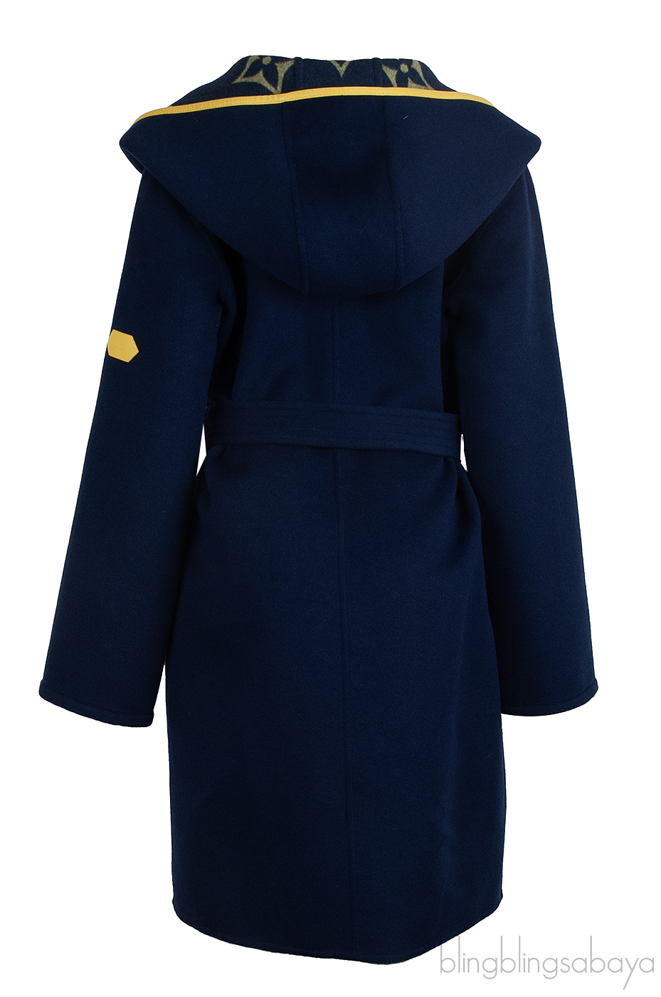 This Louis Vuitton Blue Wool Coat from Wool and silk fabric in blue color with contrasting yellow leather trim. This jacket features a hooded design, yellow monogram print inside, open front with detachable belt.