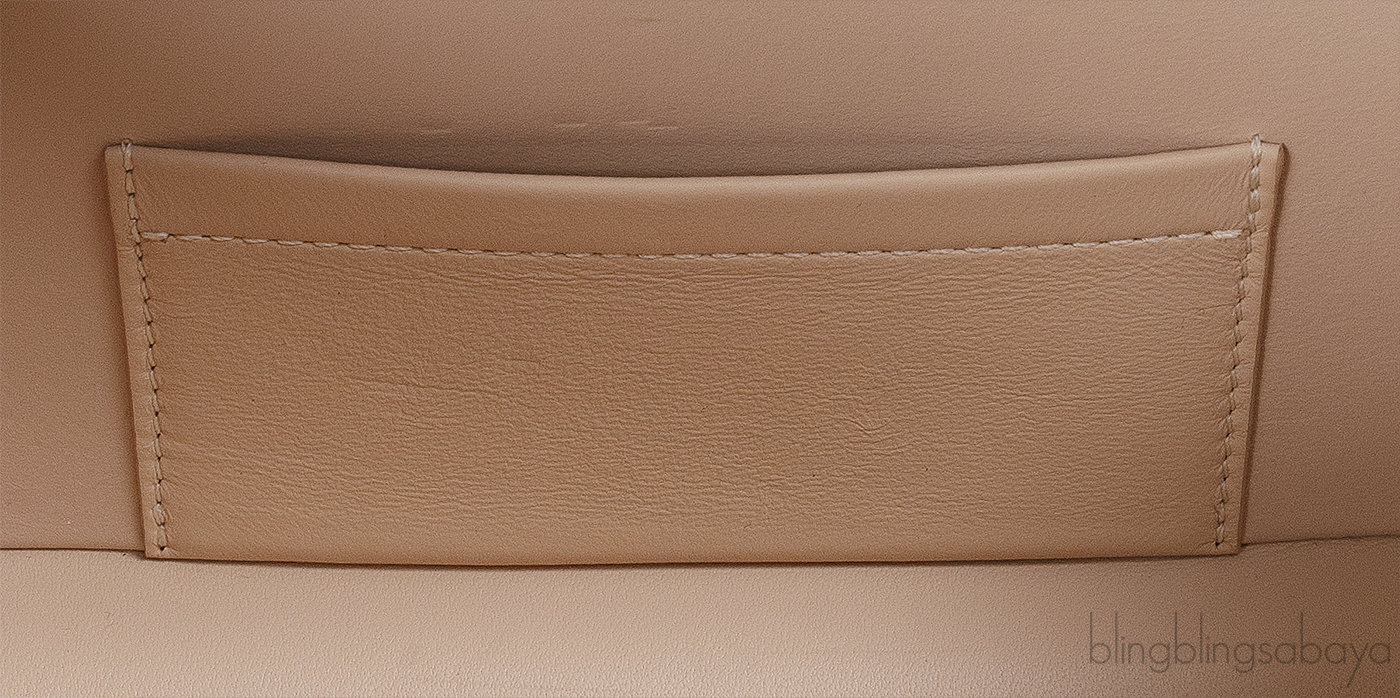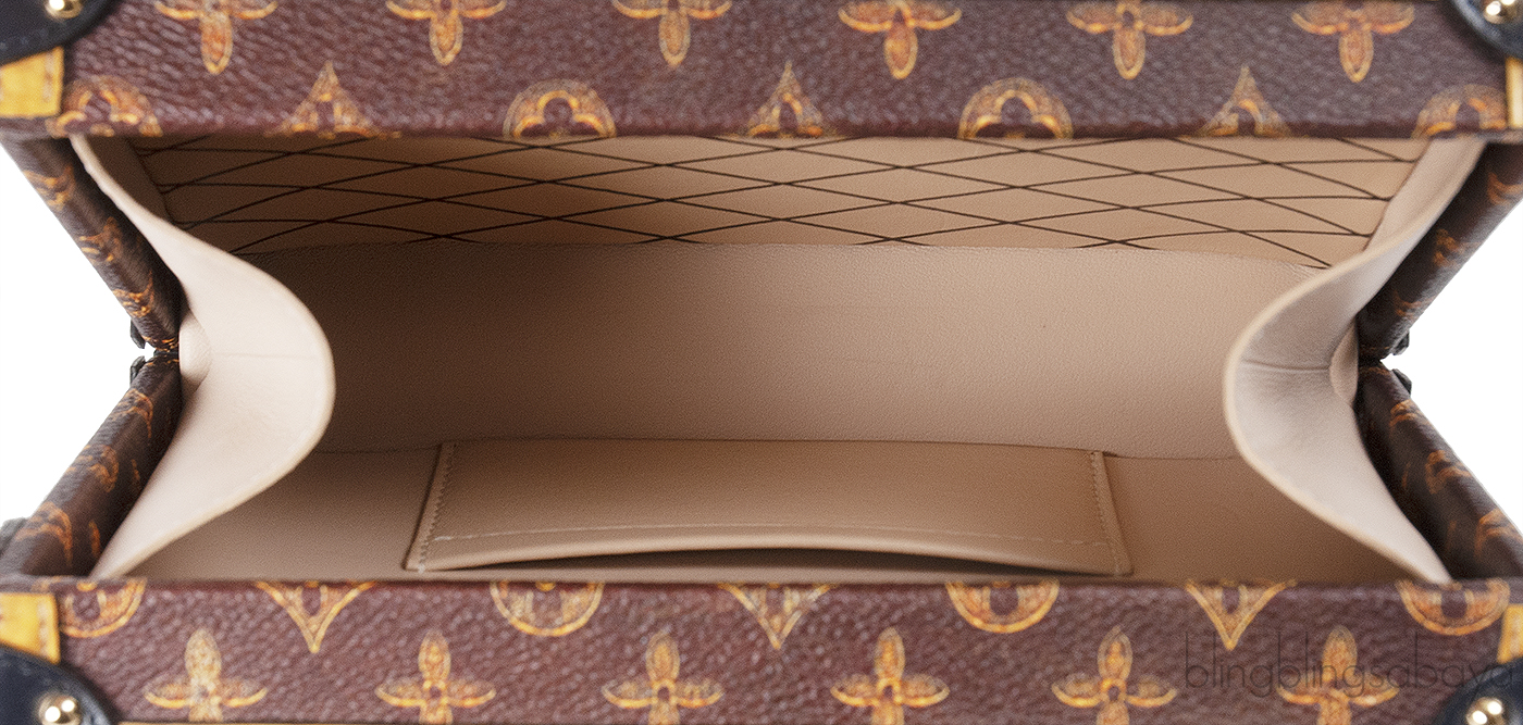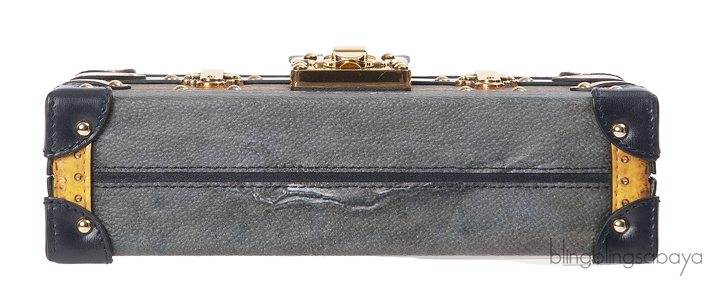 This petite malle clutch features a push lock closure at front and has an interior fully lined with beige leather and one small patch pocket inside. This clutch has a removable black shoulder strap that lets you carry it as either a clutch or a shoulder bag.