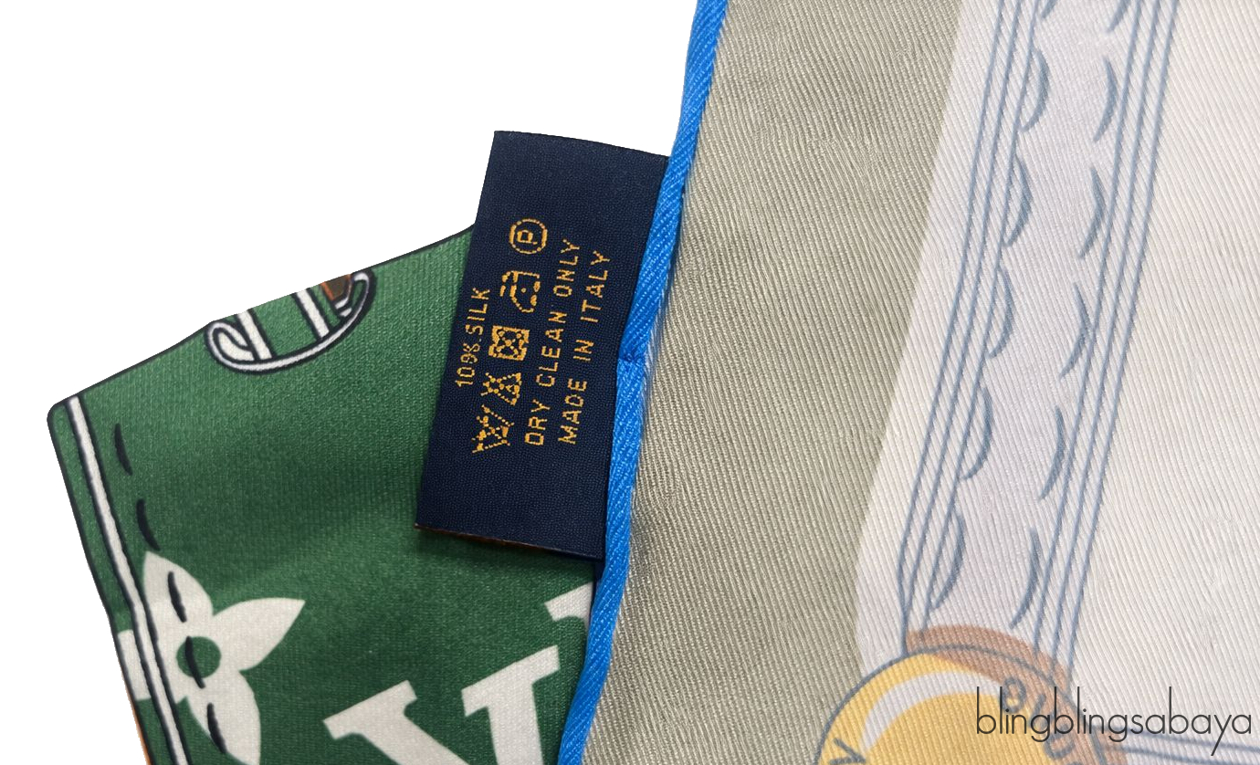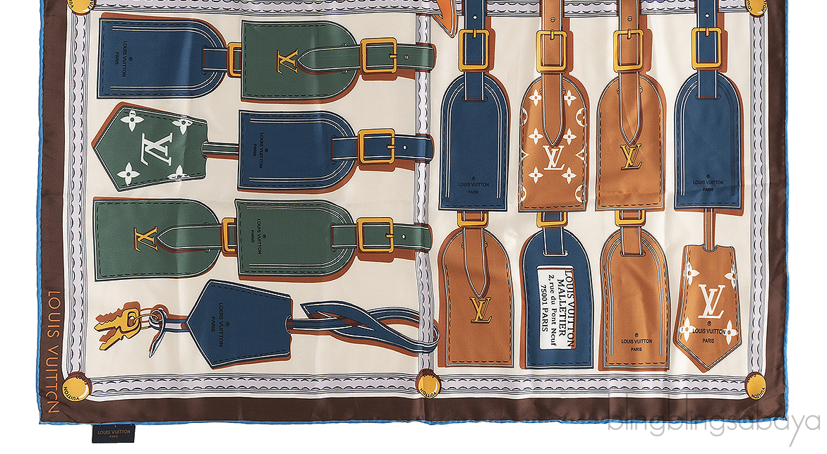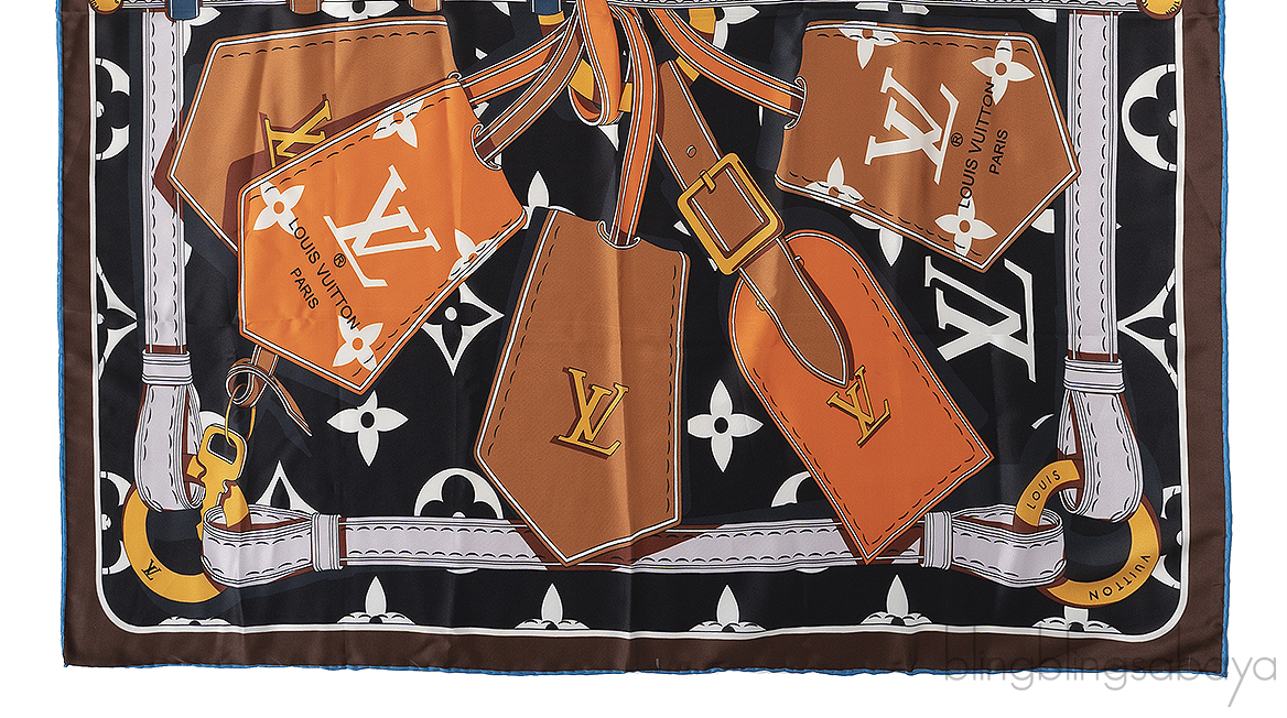 This Louis Vuiton Printed Scarf is crafted from 100% Silk fabric. This scarf features a multicolor luggage tag print motif, monogram print with a brown frame and rolled edges .