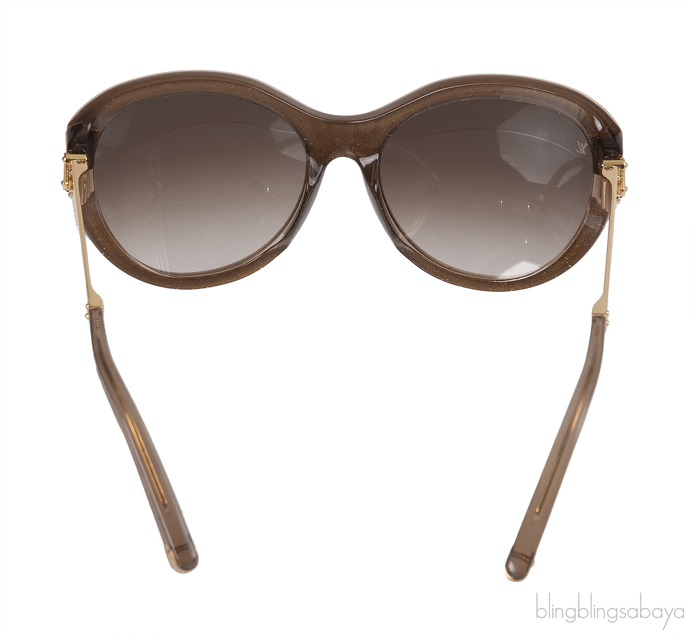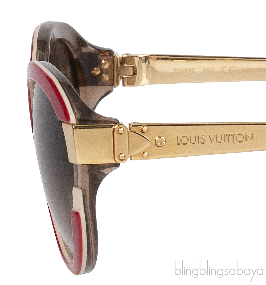 This Z0689E Soupon Cat-eye Sunglasses from Louis Vuitton features a three layered acetate frame in glittery brown, beige and red color. It has logo2 engraved in gold metal hands and gradient color effect lenses.