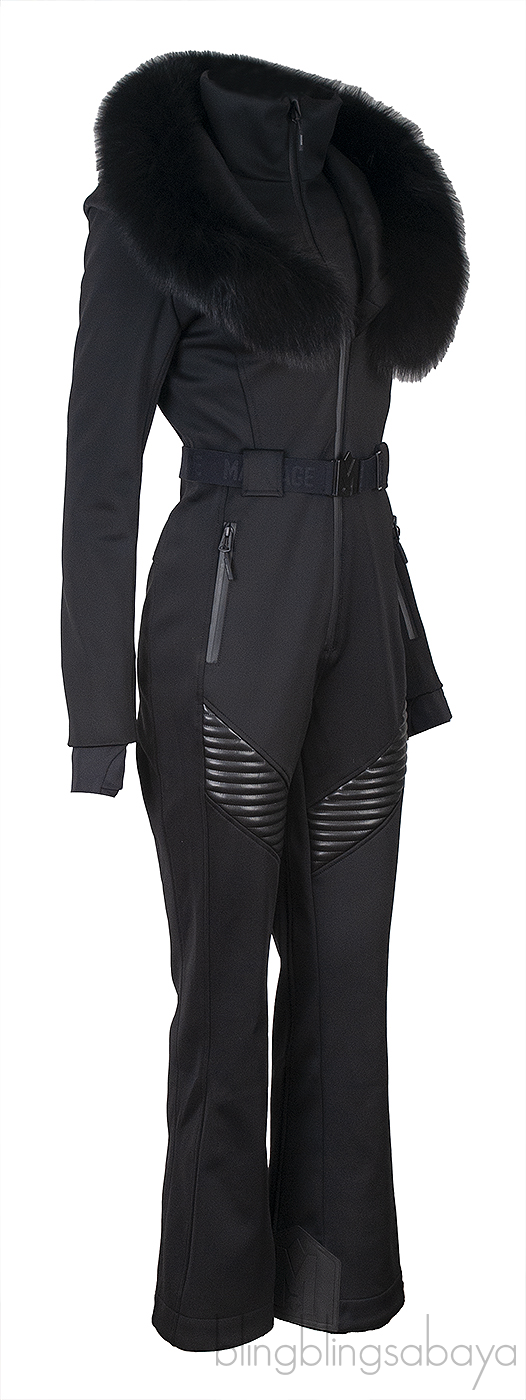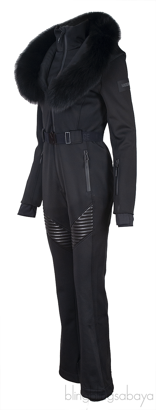 This Mackage Black Elle Hooded Belted Shearling-trimmed Padded Ski Suit is crafted in 82% Polyamide and 18% Elastane; filling 100% Polyester and 100% Fox Fur trim. This ski suit features a detachable fur hood, long sleeves, zip fastening , 2 front zipped pockets, zipped arm pocket, Water-repellent and windproof, cuffs; Scuff guards at inner legs and comes with elastic belt with buckle.