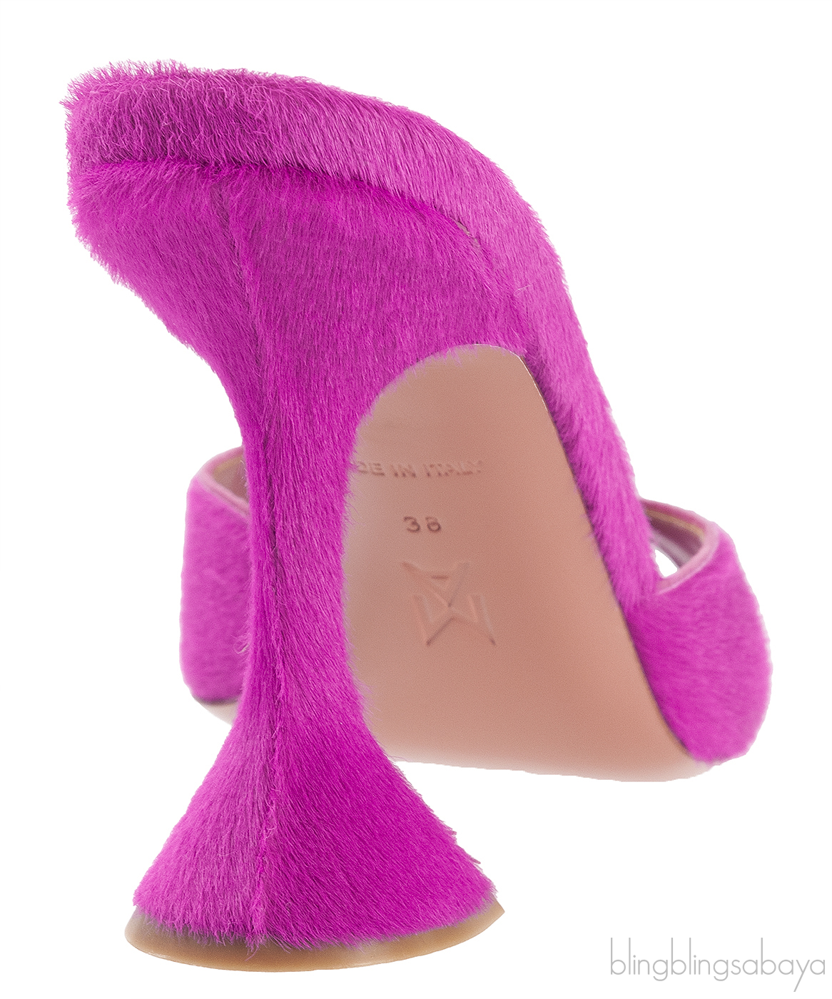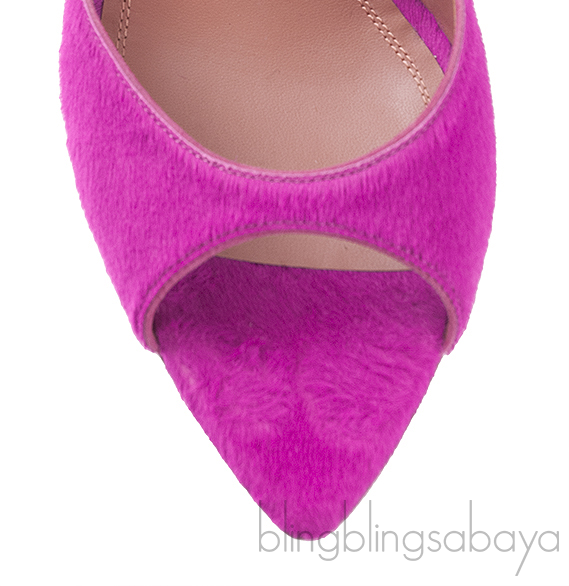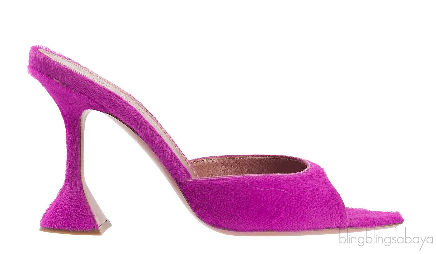 These Magenta Pony Hair Caroline Sandals from Amina Muaddi are crafted from Magenta Pink Pony hair upper with leather lining. These heels features a pointed open toe, leather lined insole and curved heels measuring 95 mm high.