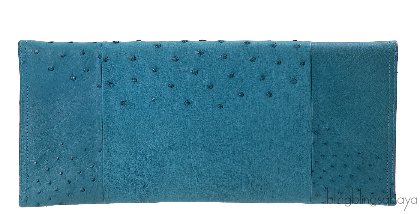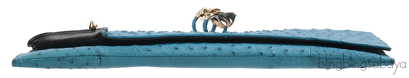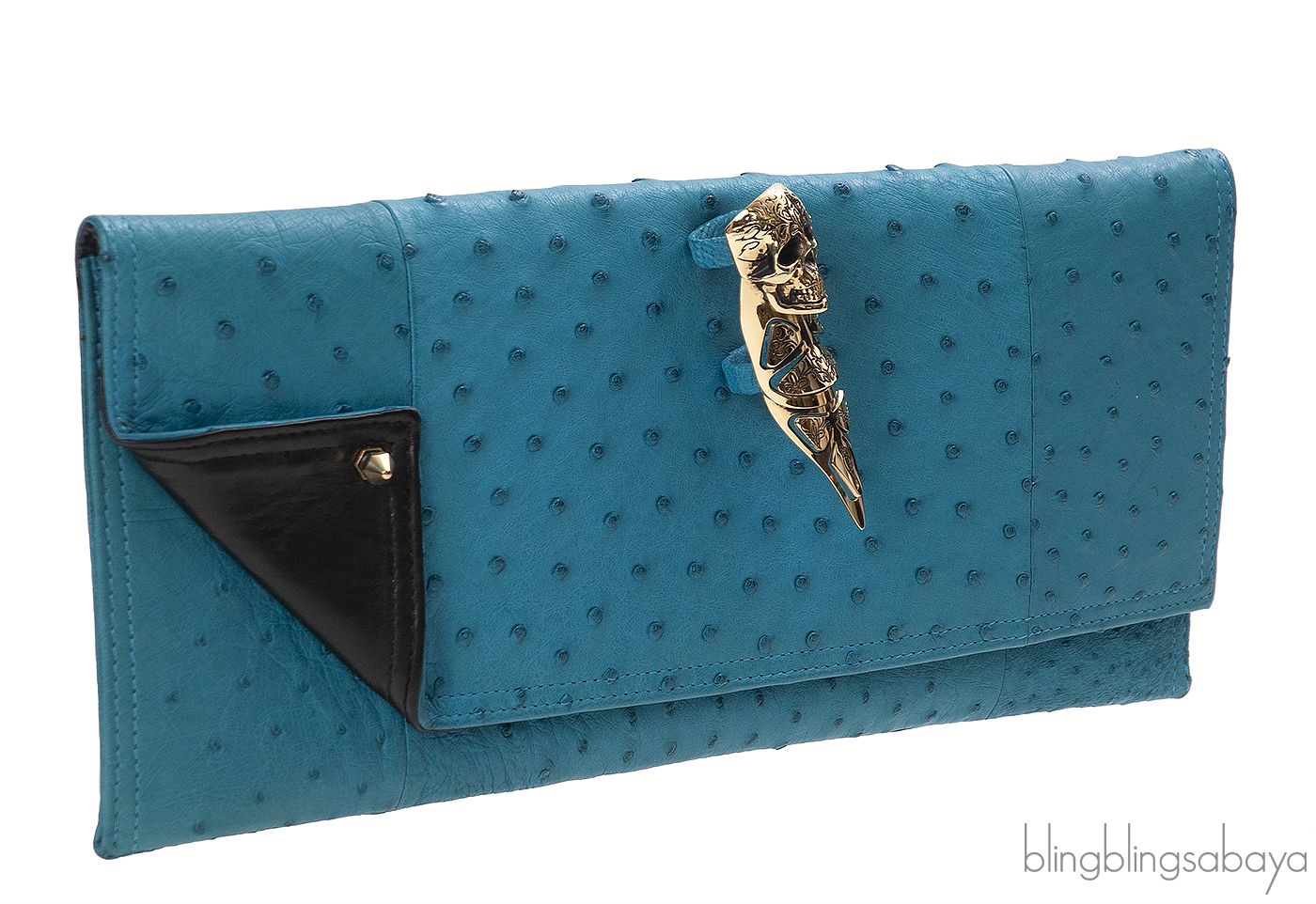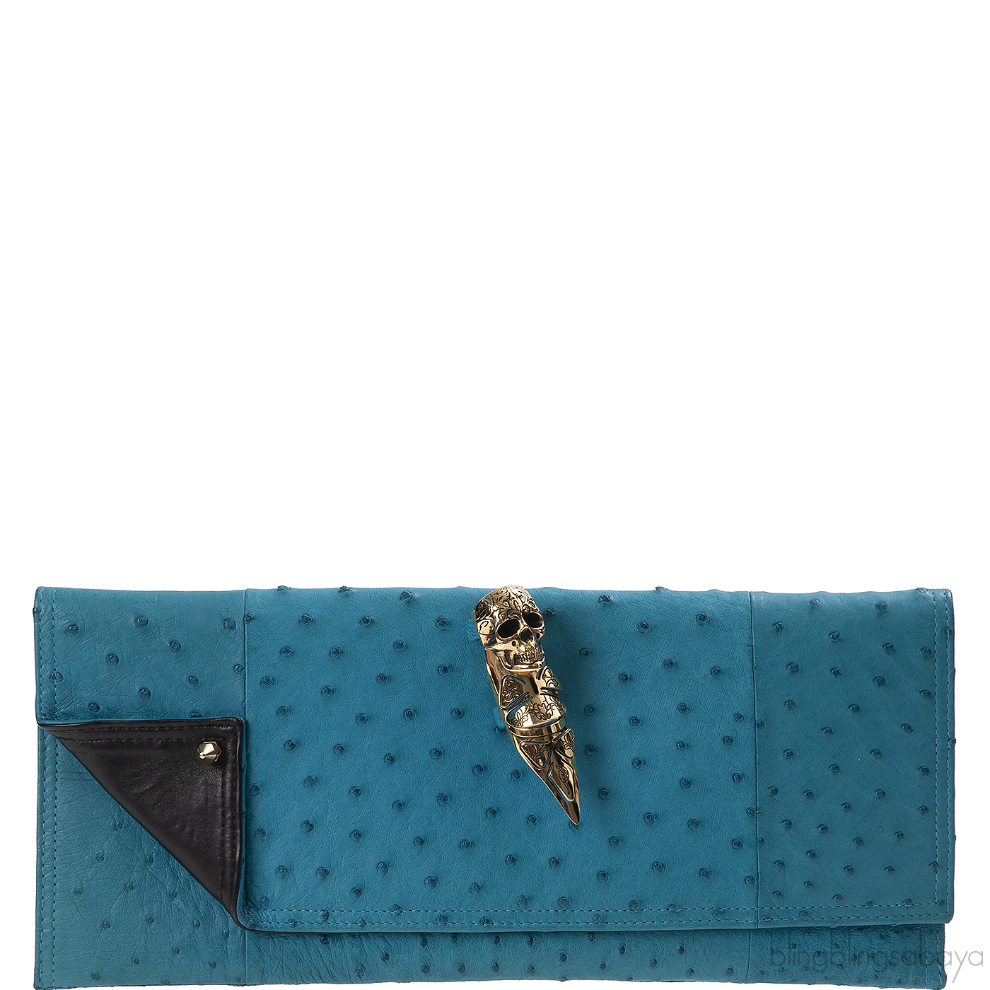This stunning Ostrich Knuckle Ring Clutch from Maison Du Posh is crafted in Aqua Marine Ostrich Leather featuring a painted nickel-plated skull ring and a spike that embellishes the left flap corner. This features a magnetic flap closure and interior is fully lined with soft black laether and has one patch compartment inside.