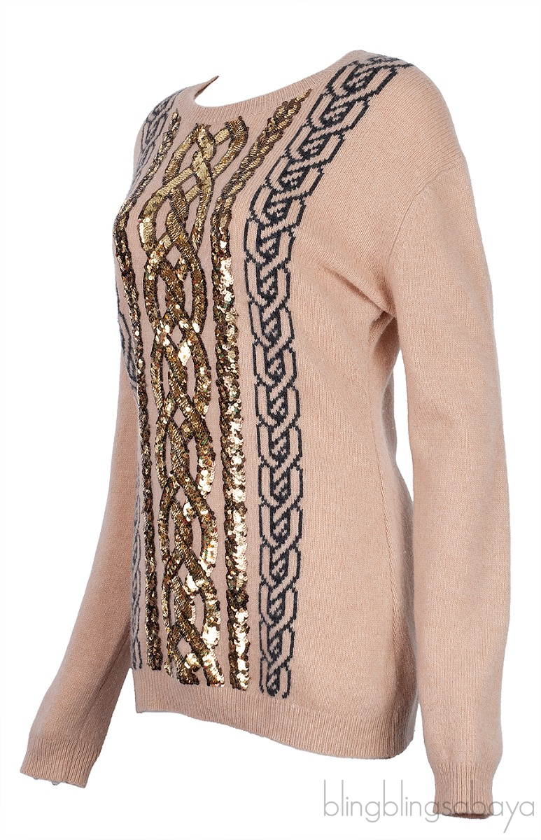 This Brown Wool Sequins Knit Sweatshirt from Markus Lupfer are crafted from 100% Wool fabric in brown featuring a round neckline, long sleeves with ribbed cuffs and hemline and has black cable print and sequins embellishment at front.