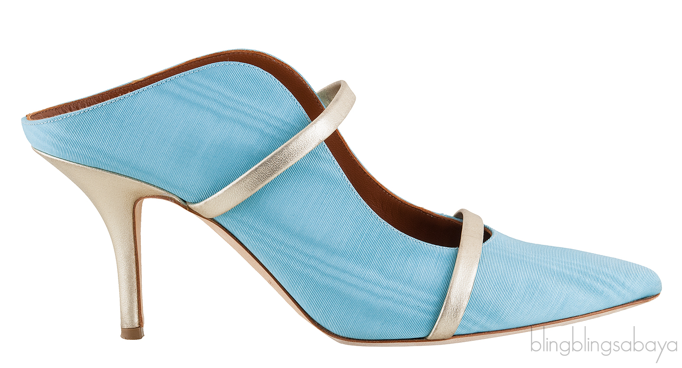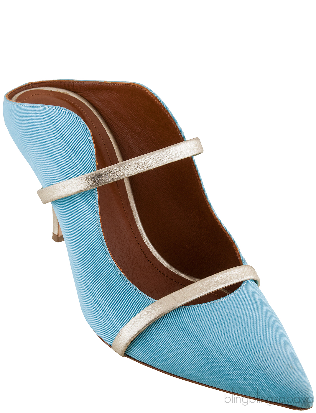 These Maureen Sky Blue Mules from Malone Souliers are the brands signature style. These stunning mules are made of sky-blue fabric upper with brown leather lining, pointed toe and high stiletto heels, slip-on style, leather sole and finished with light gold straps that sit across the foot.