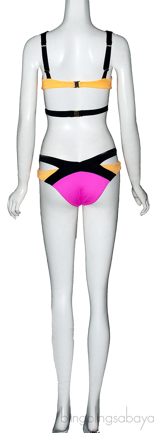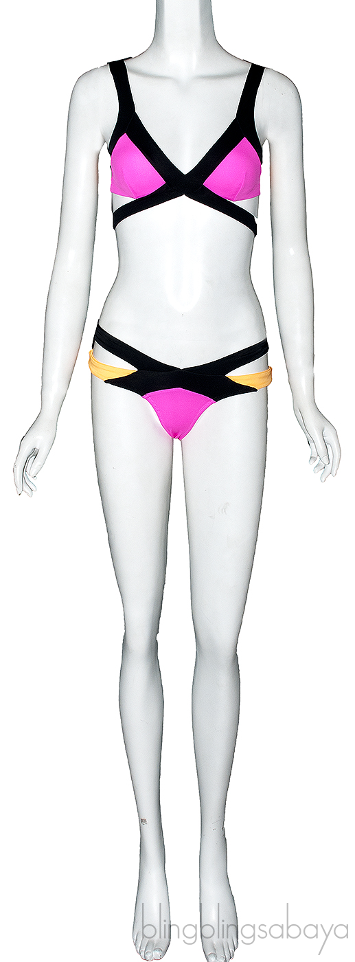 This sexy Mazzy Neon Orange/Neon Pink Top & Bikini from Agent Provocateur are made of 68% Polyamide Fabric and 17% Elastane in neon orange and pink. The triangle bikini top is both sporty and sexy, with gold cups. Contrasting grey bandage-style straps wrap over the shoulders and create dramatic slashes across the torso.