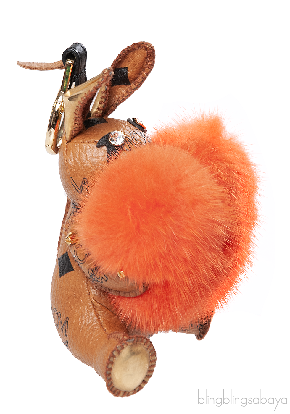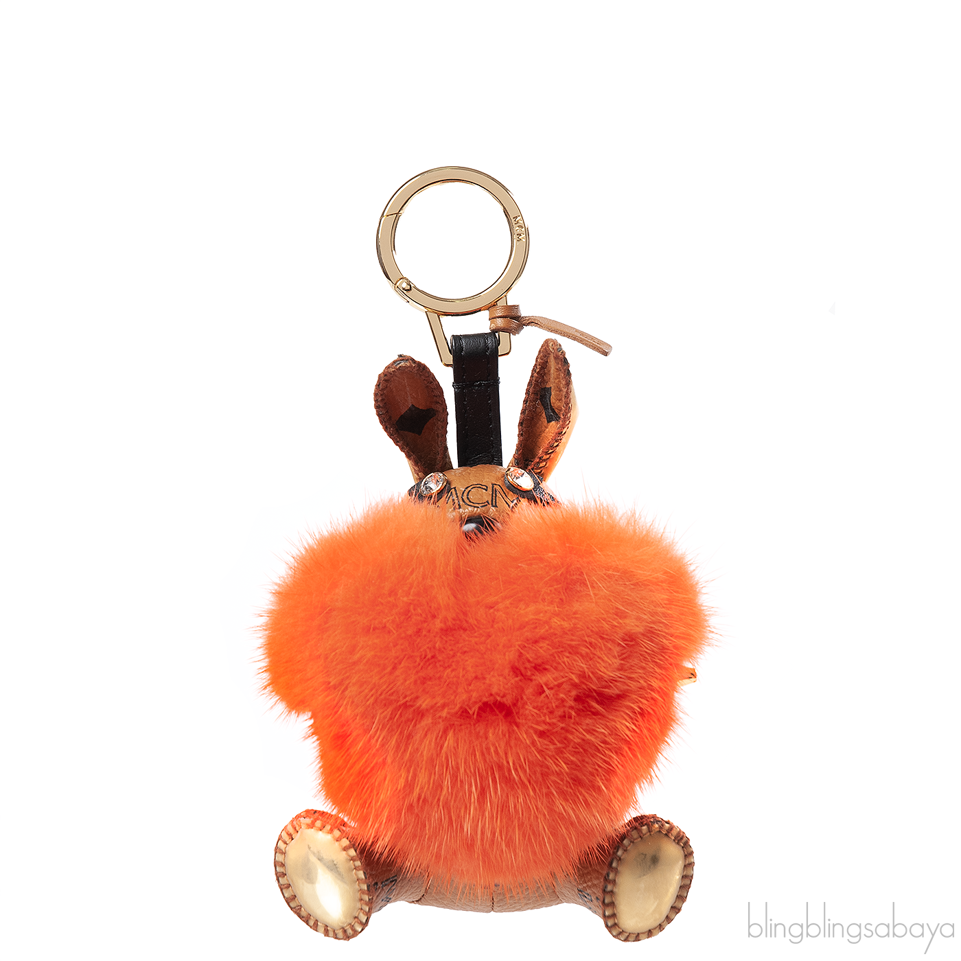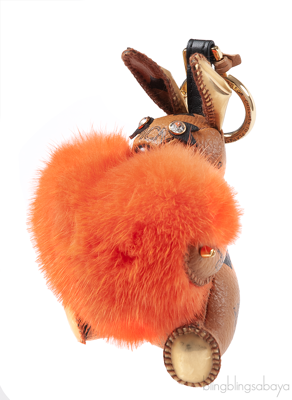 This cute Printed Rabbit Heart Charm from MCM is crafted in signature visetos coated canvas in brown with metallic trim and 24k gold plated hardware. embellished with glass crystal eyes and orange heart mink fur at front. This has a spring clasp to attach to bag or keys.