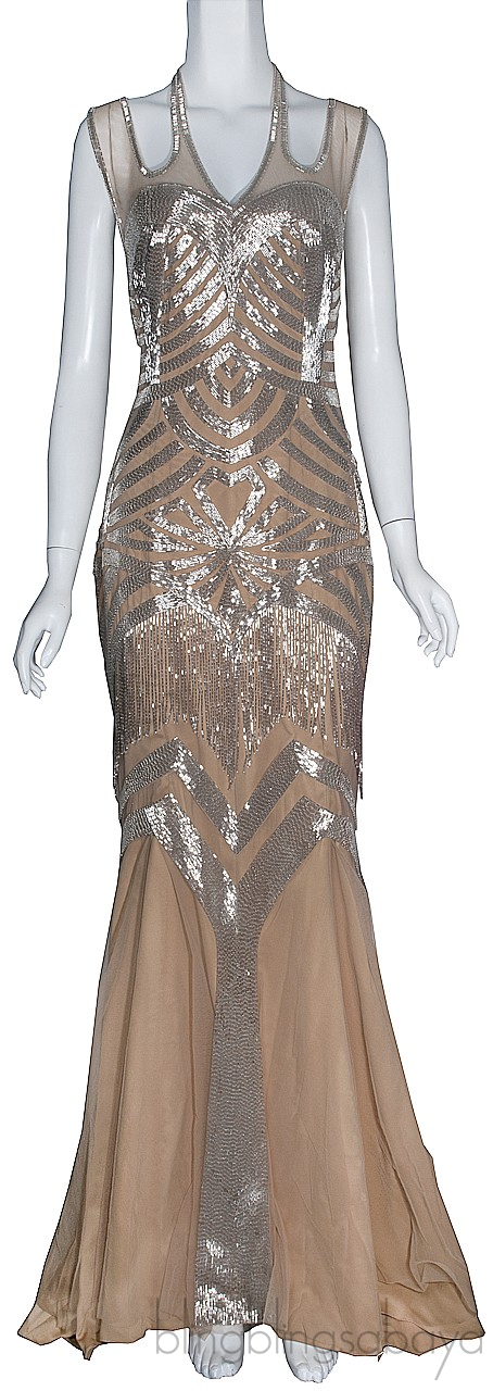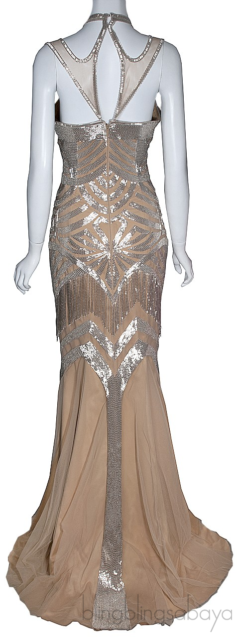 Long Mermaid Beads Embellished Dress from Walid Atallah is made of silk chiffon brown fabric. Features a figure hugging mermaid cut dress artfully embellished with silver beads, sleeveless, cut-out shoulder strap with beads trimming, hook and zip fastening at rear, fringed beads detailing down the hips and long skirt with sweeping train. (measurements are just approximate)