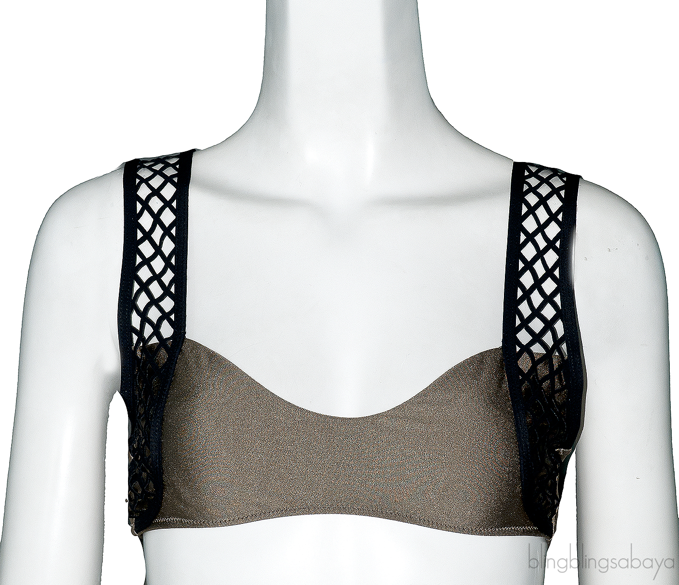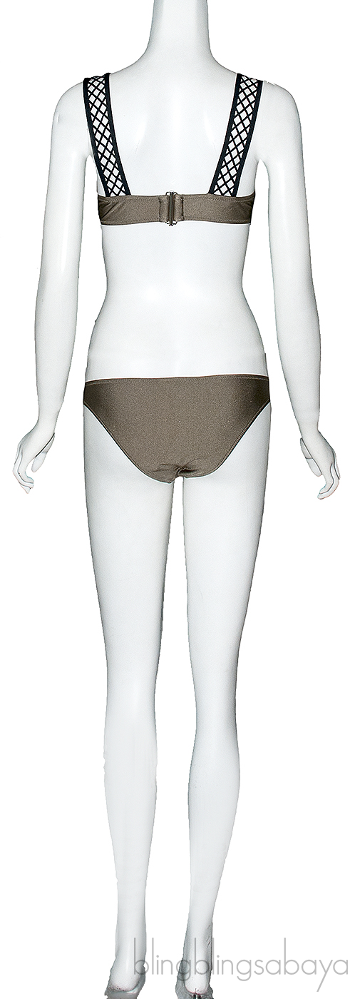 This Metallic Knox Lattice Trimmed Bikini & Top from Shimmi is made of 80% Nylon and 20% Elasthanne. with Metallic knox and black with net design on strap.