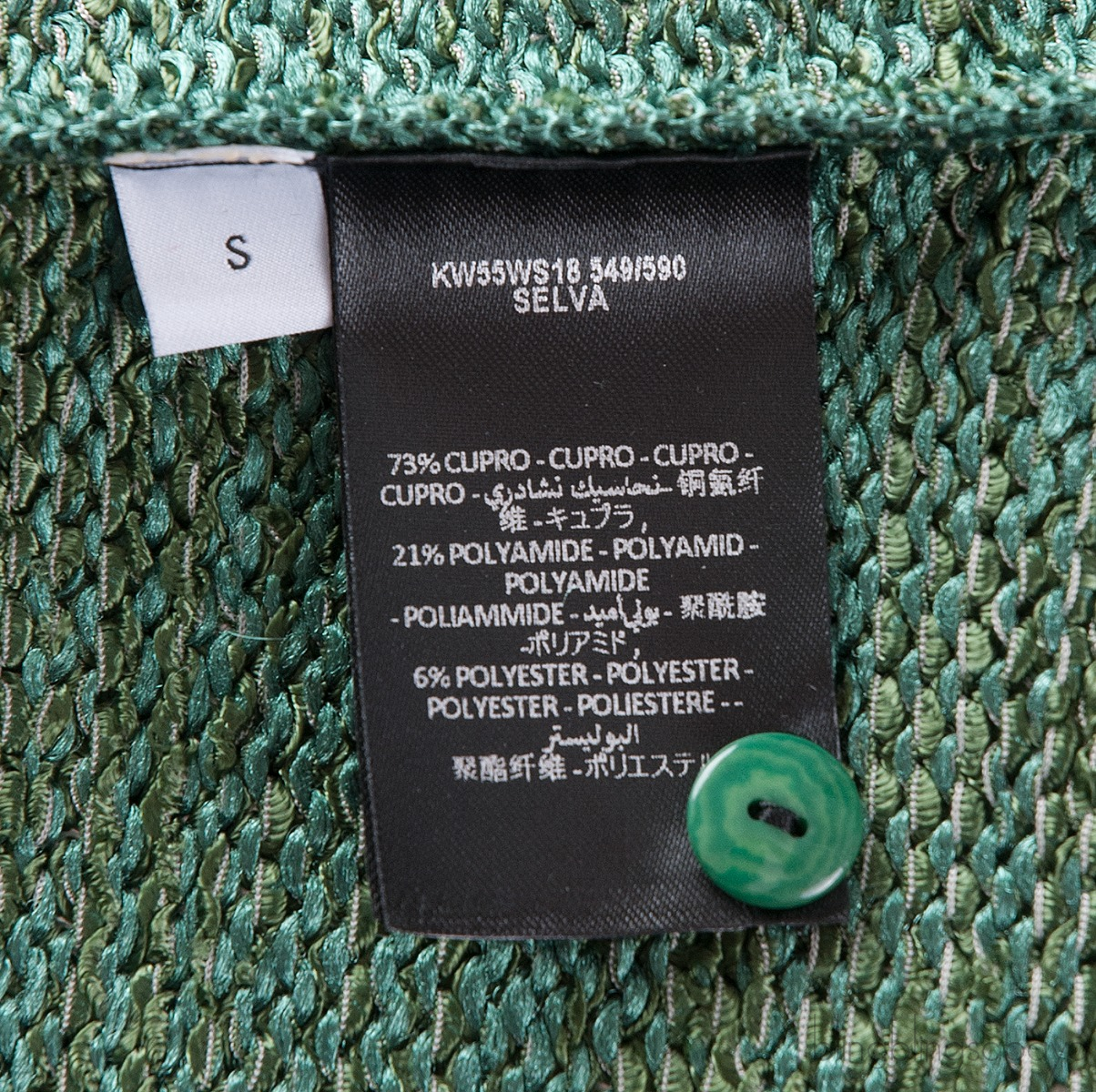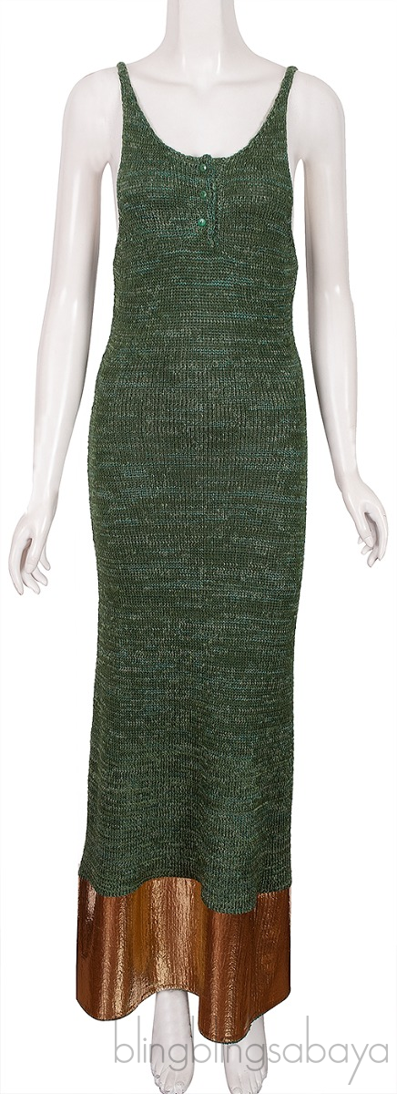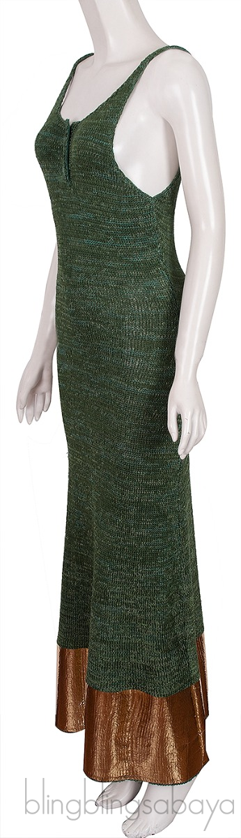 This Metallic Paneled Knitted Maxi Dress from JW Anderson is made from 73% Cupro, 21% Polyamide and 6% Polyester. This dress featured a knitted stretch fabric in green, sleeveless, scoop neckline, button fastening at front, maxi length with metallic gold panel on hem.
