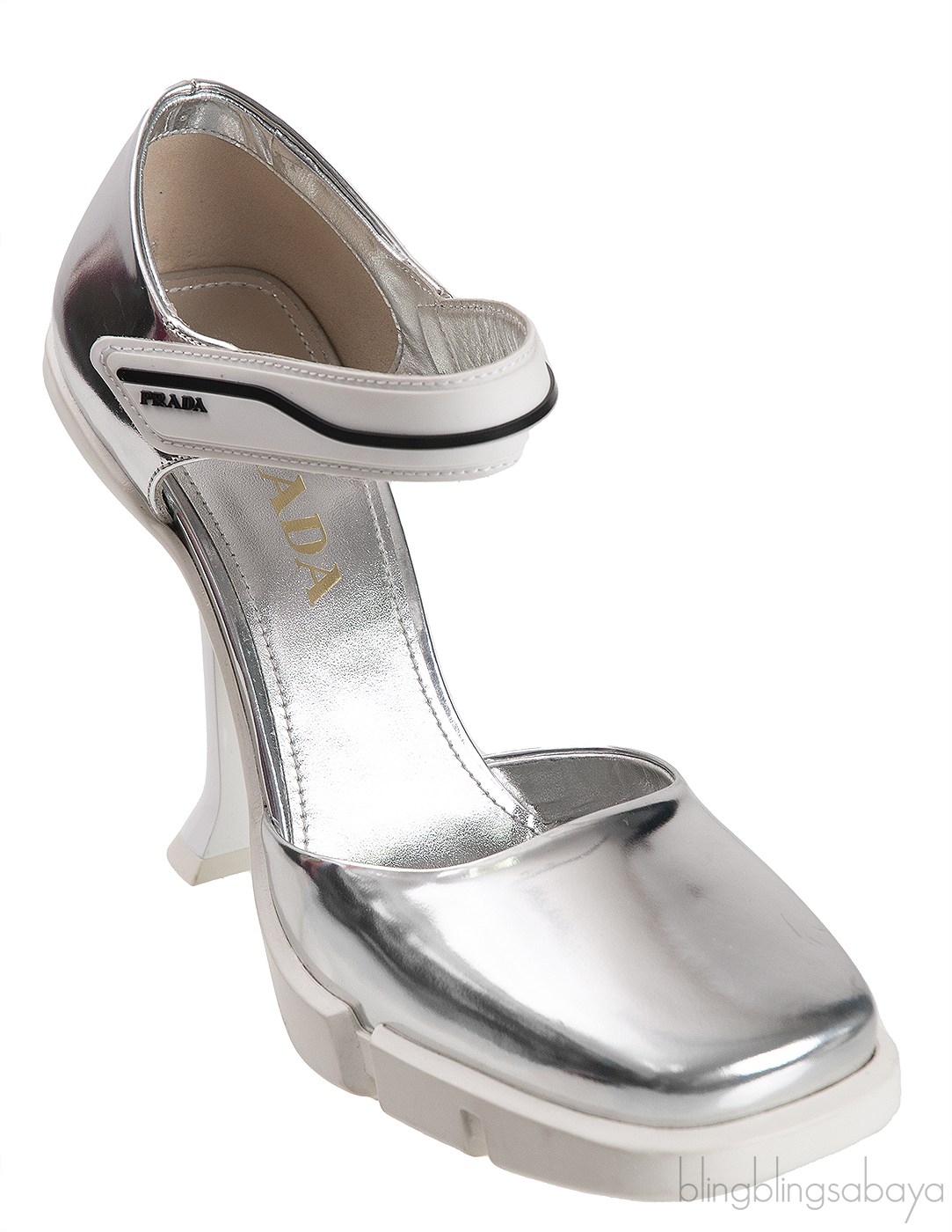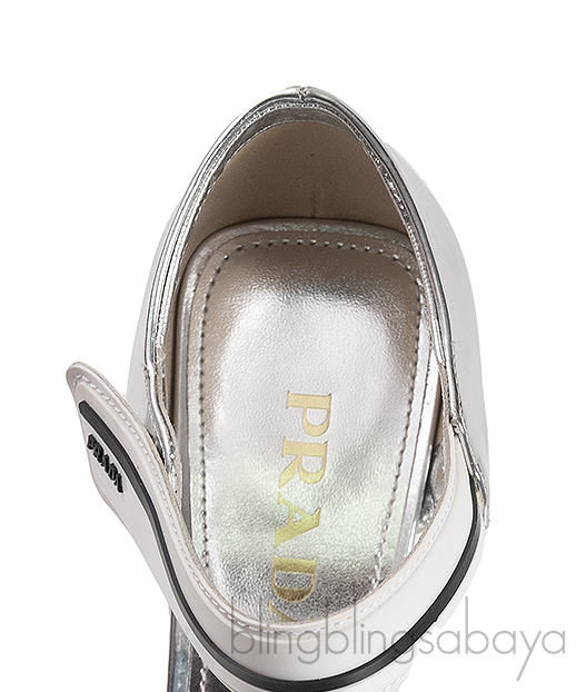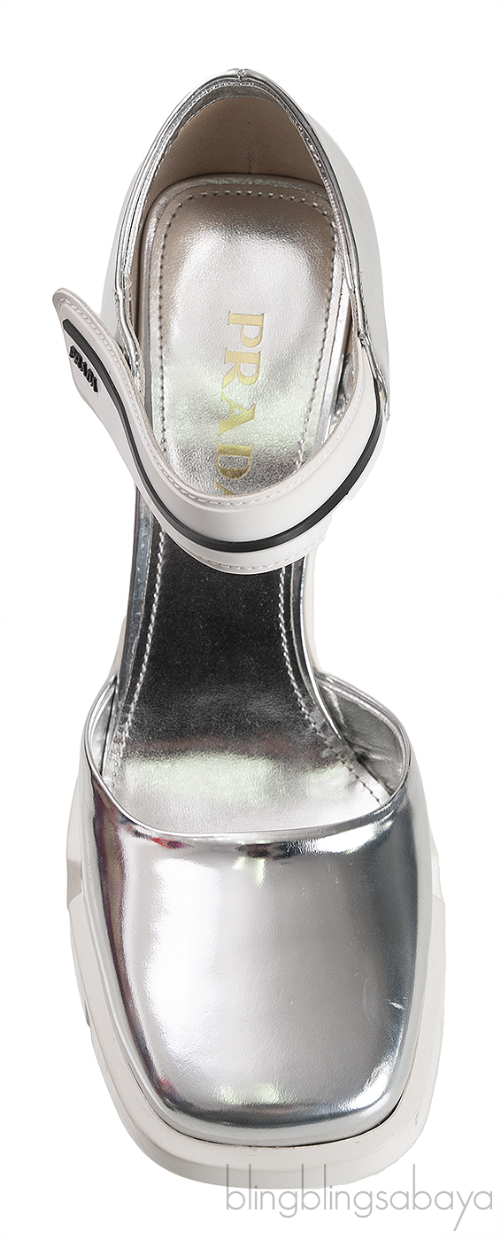 These Metallic Silver Leather Pump from prada are crafted from metallic silver calf leather lining. this features a square toe with elasticated strap, leather insole and rubber sole and heels measuring 105 mm high.