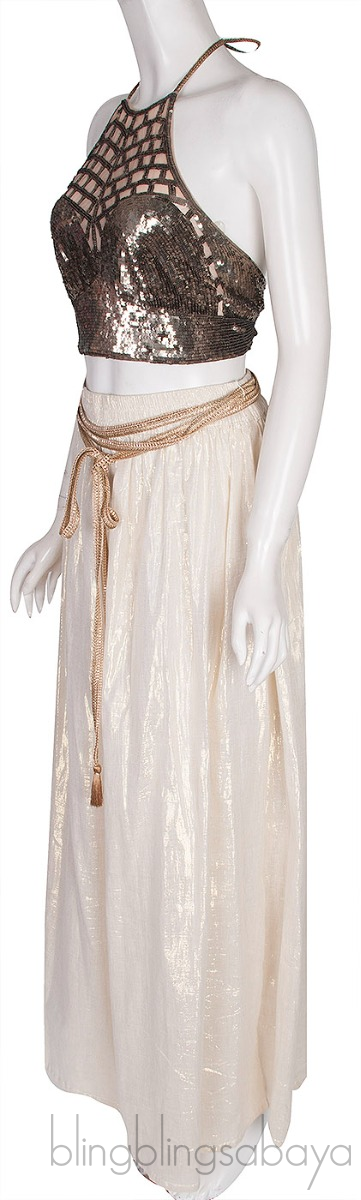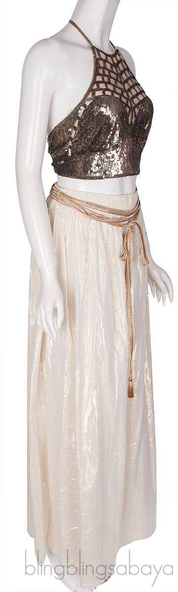 This Sequin Halter Top from Miguelina is crafted from 100% Nylon. This crop top features a halter design fully embellished with sequin in gold, strap fastening at neck and rear.
